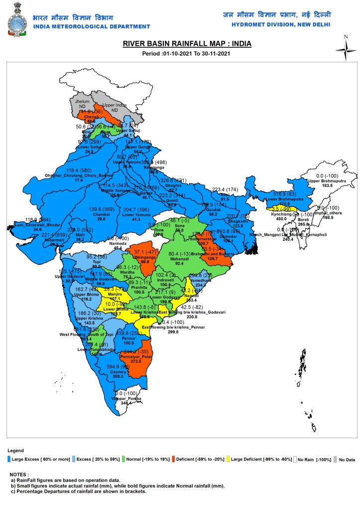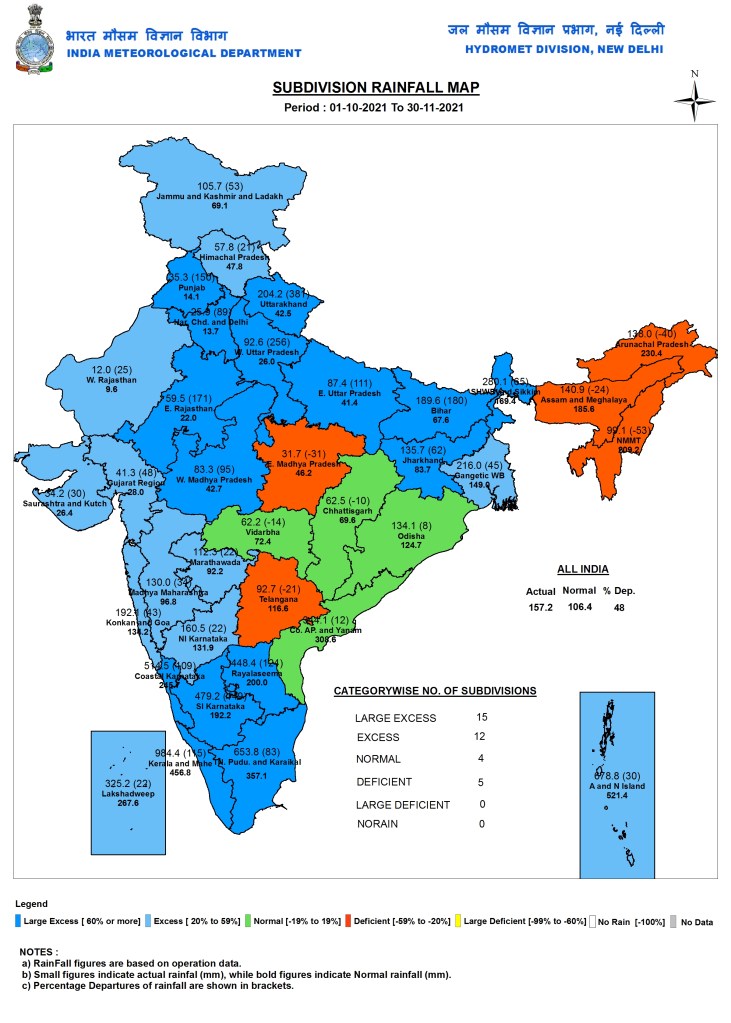 All India Rainfall Maps As can be seen from the IMD’s Meteorological division wise rainfall map for North East Monsoon as on Nov 30, 2021, 15 divisions had Large Excess, 12 divisions had Excess, 4 divisions had Normal and 5 divisions had deficit rainfall during Oct-Nov 2021.