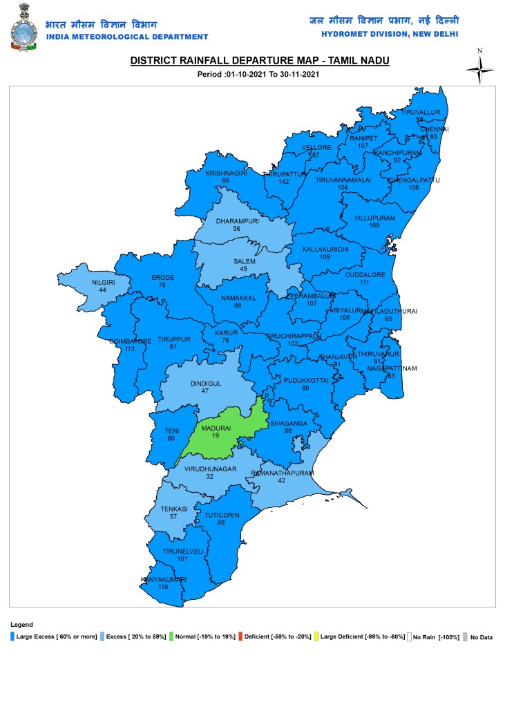 Tamil Nadu The IMD’s rainfall map for Tamil Nadu shows that out of 38 districts in the state, one district had normal rainfall, 7 had Excess rainfall and 30 had large excess (60% or more above normal). 13 of them had more than 100% above normal rainfall, with Villupuram having the highest excess at 169%. Six districts had above 1000 mm rainfall, with Chennai having the highest rainfall at 1150.2 mm during the two months of Oct-Nov 2021.