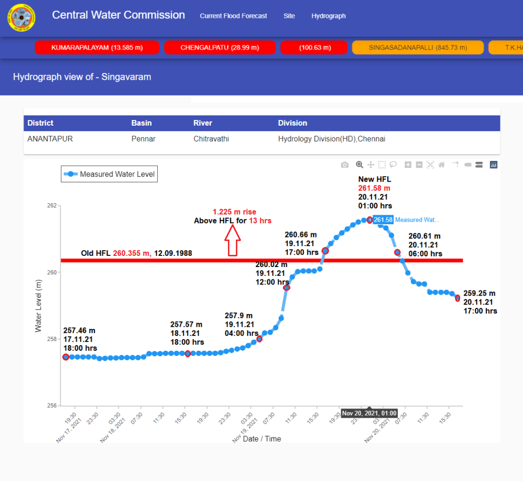 | 1 | Narasinga-rayanipet Poini | Chittoor Andhra Pradesh | 269.03 m | 27.11.2020 | 269.59 m | 19.11.2021 09:00 hrs | 0.56 m | 17 hrs | Yes | |