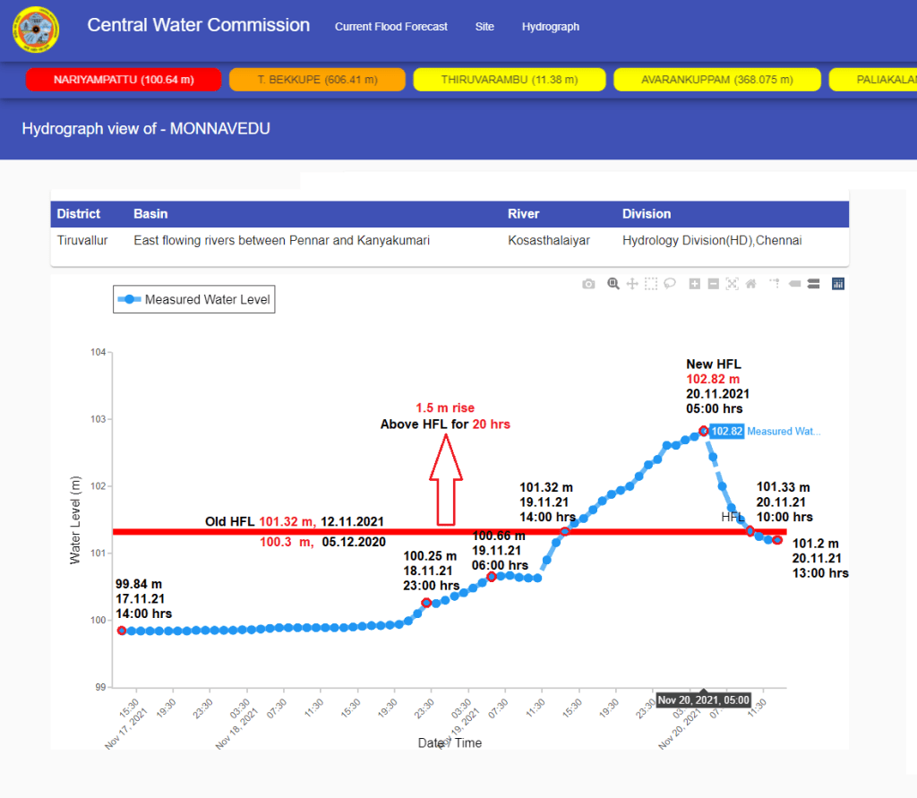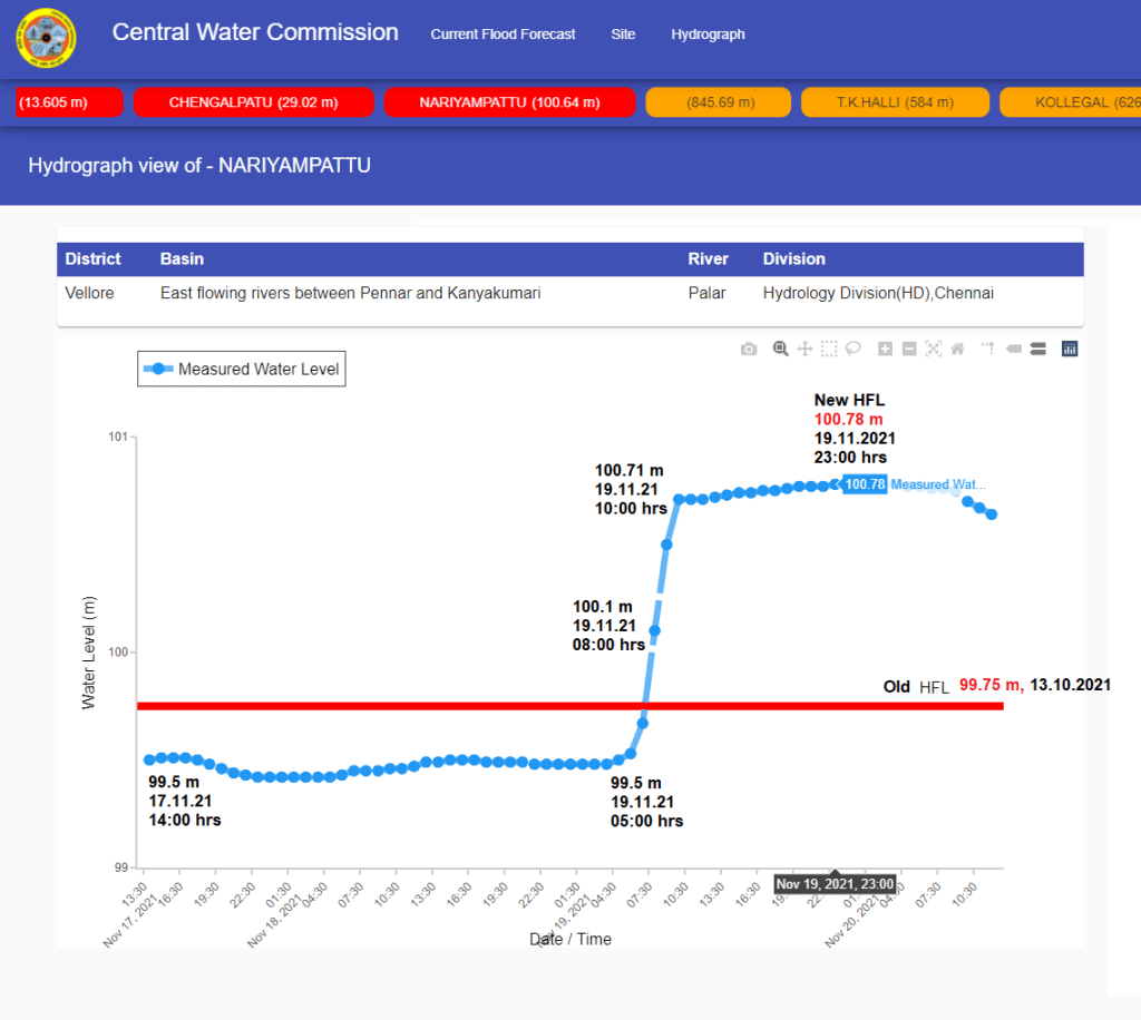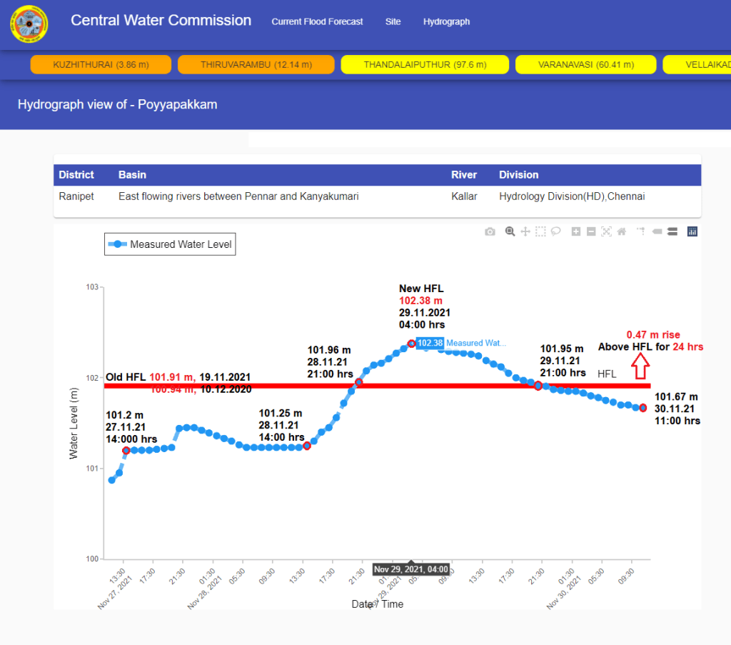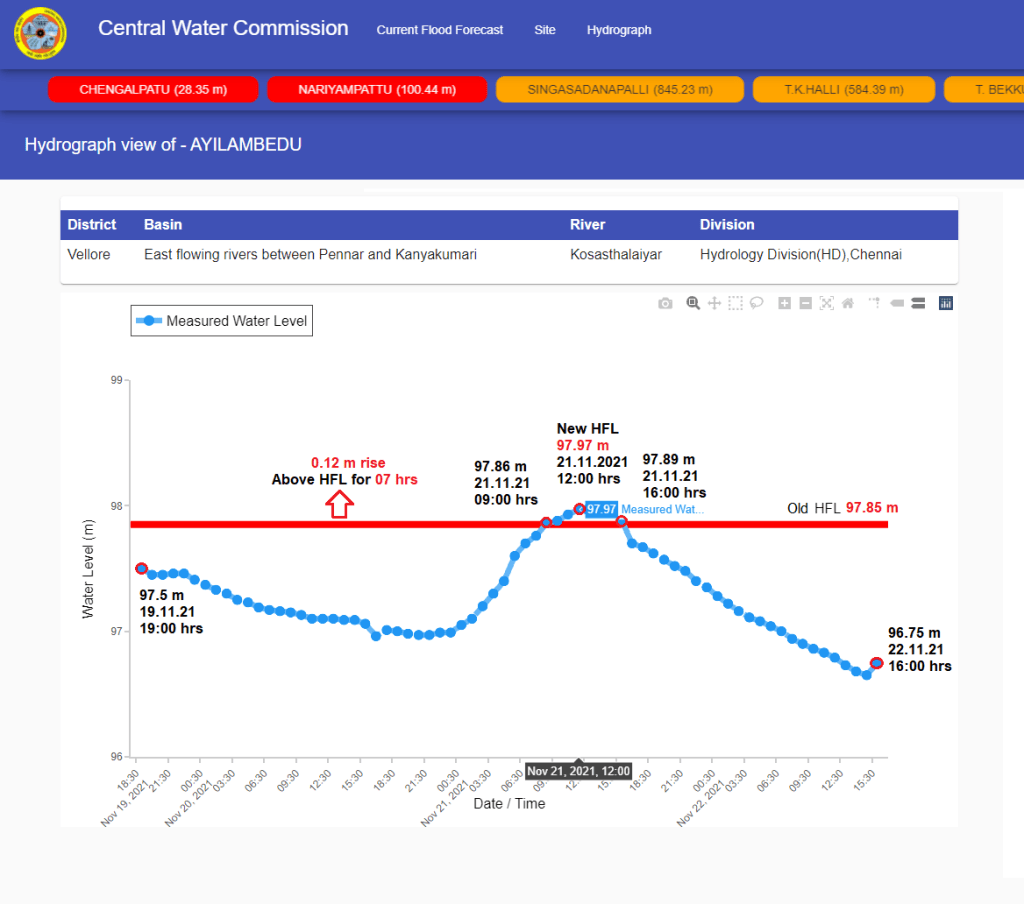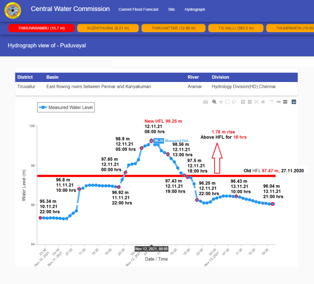 CWC lacks old HFL dates for Panneswaram Madam site on Ponnaiyar river and Ayilambedu site on Kosasthalaiyar river. It has not updated new HFL records for Poyyapakkam and Venganur site on Periyaodai river. Thirunavalur is newly functioning site on Gadilam river in Vellipuram district which witnessed significant rise on November 19, 2021 and 36.27 m is its first HFL there.