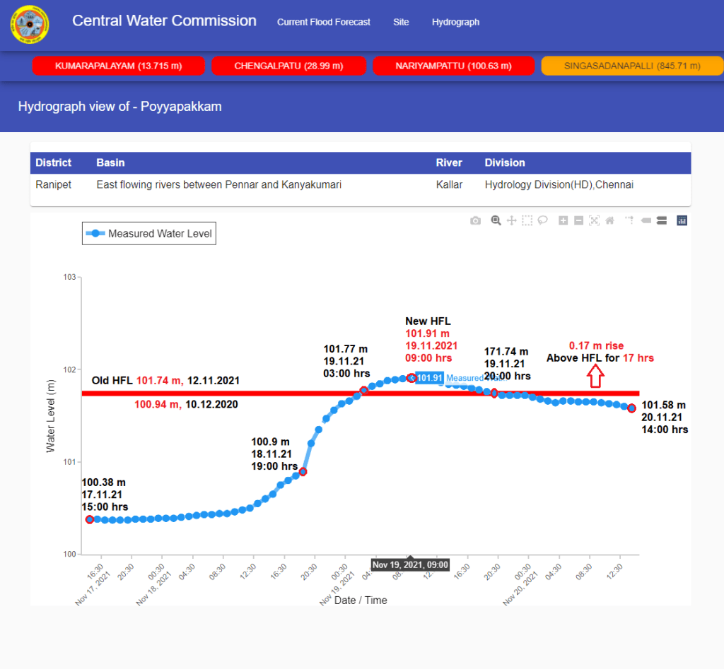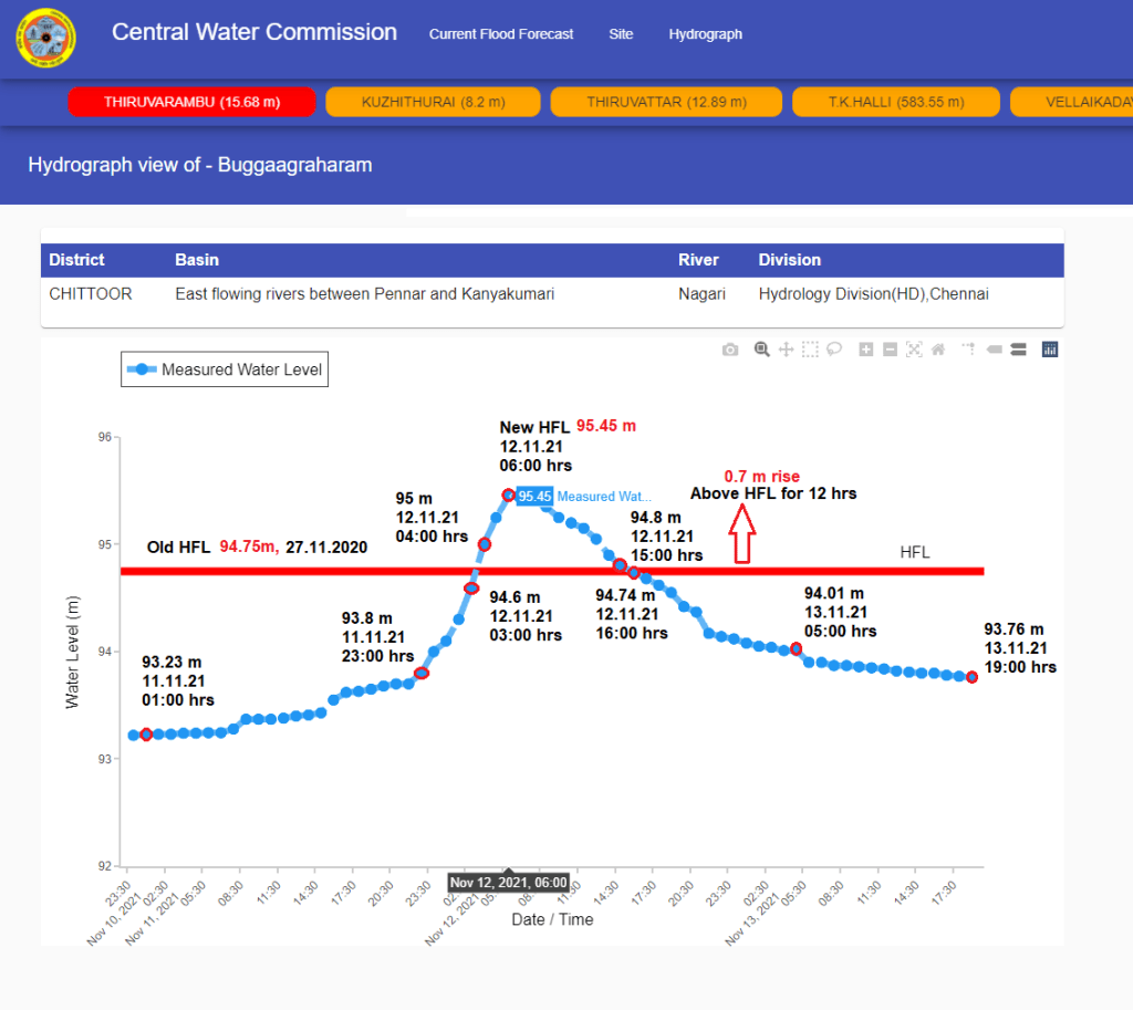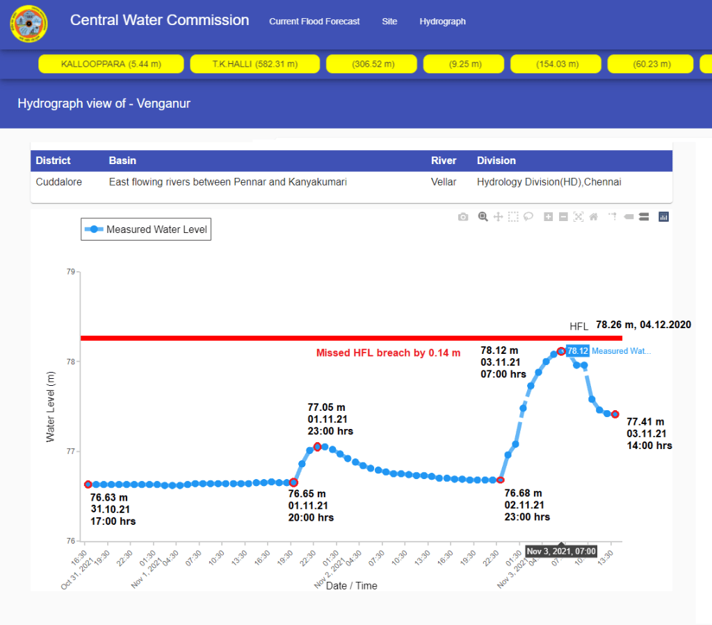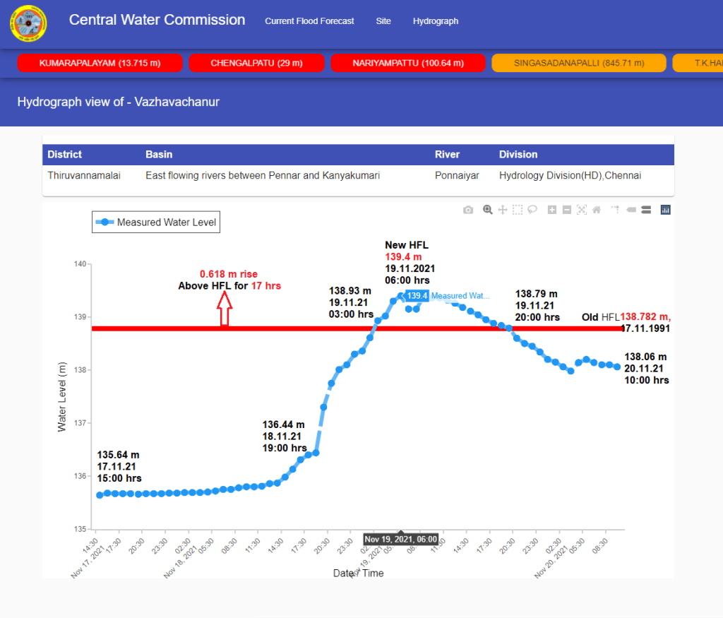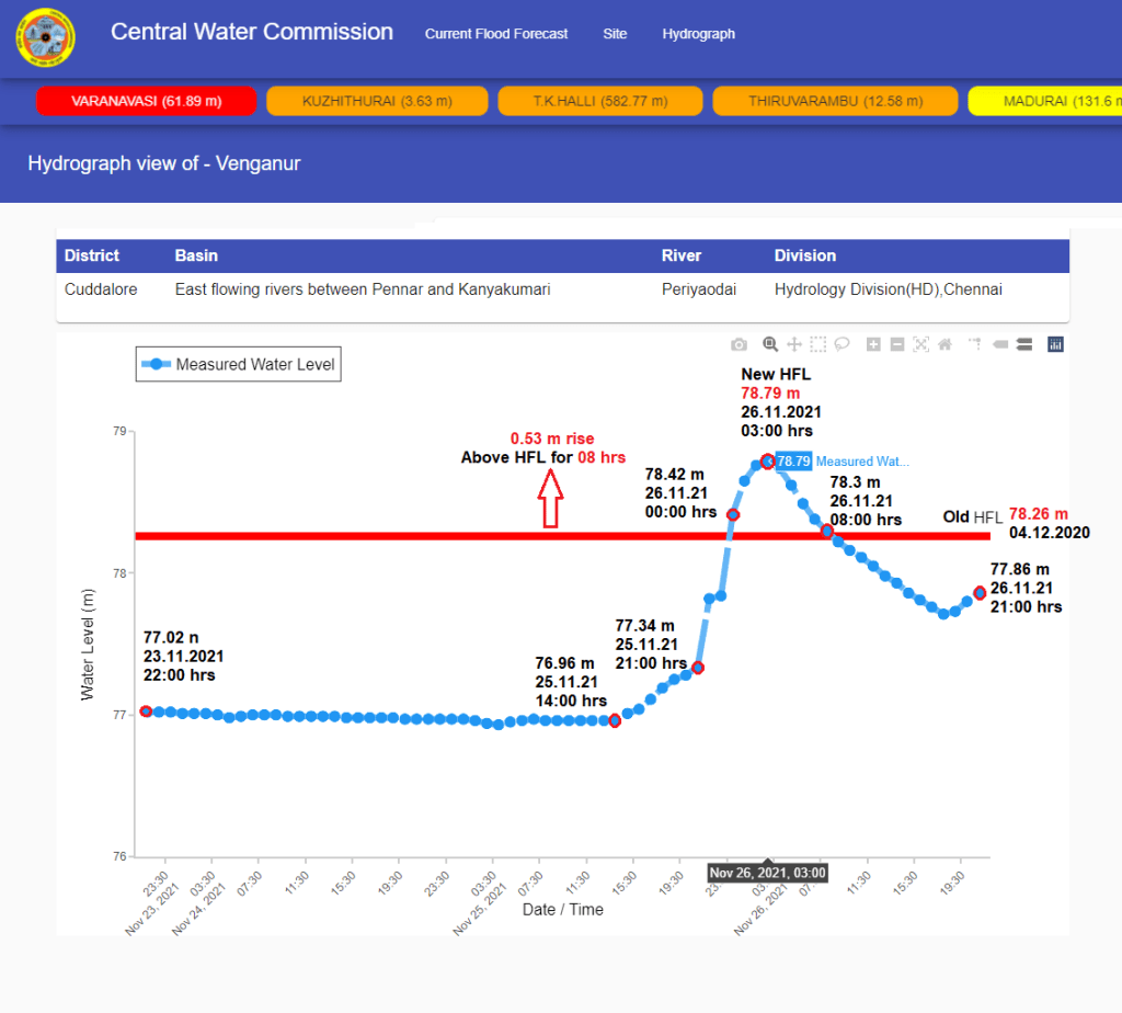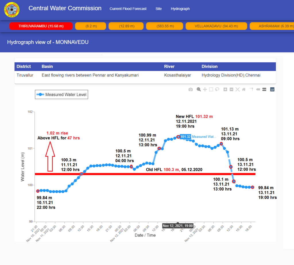 CWC lacks old HFL dates for Panneswaram Madam site on Ponnaiyar river and Ayilambedu site on Kosasthalaiyar river. It has not updated new HFL records for Poyyapakkam and Venganur site on Periyaodai river. Thirunavalur is newly functioning site on Gadilam river in Vellipuram district which witnessed significant rise on November 19, 2021 and 36.27 m is its first HFL there.