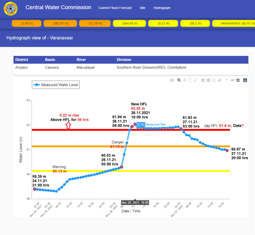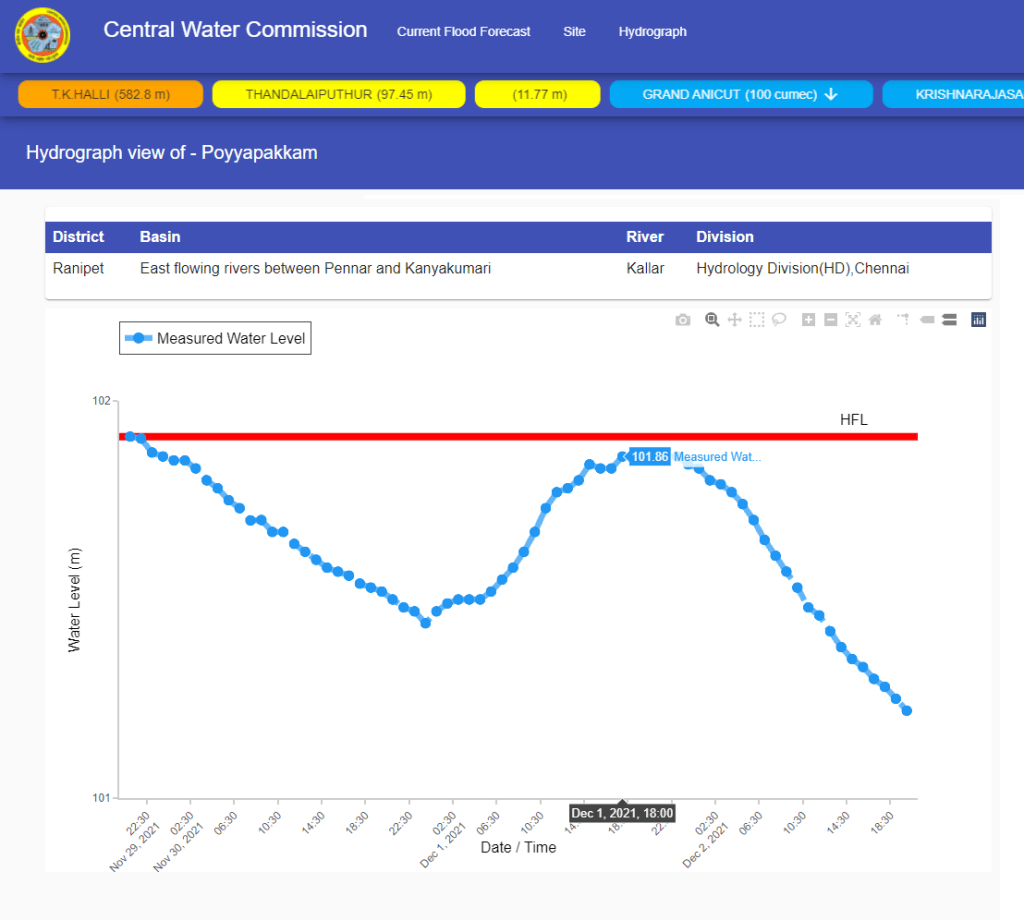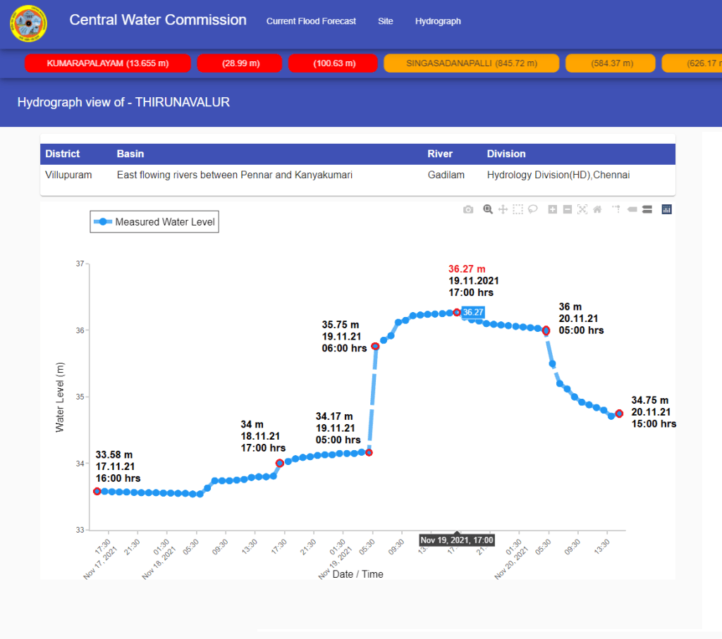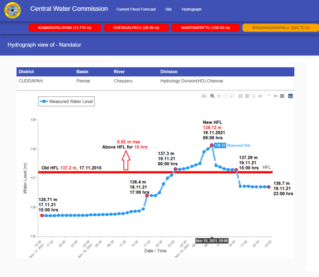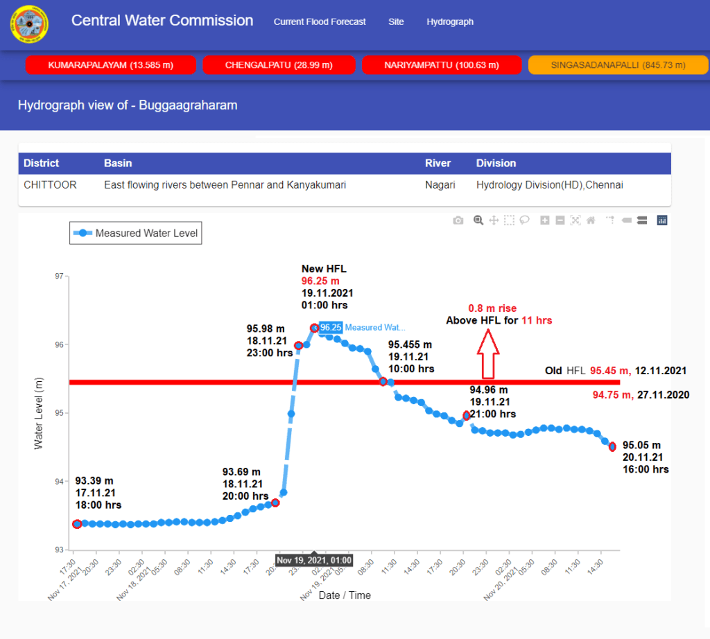 CWC lacks old HFL dates for Panneswaram Madam site on Ponnaiyar river and Ayilambedu site on Kosasthalaiyar river. It has not updated new HFL records for Poyyapakkam and Venganur site on Periyaodai river. Thirunavalur is newly functioning site on Gadilam river in Vellipuram district which witnessed significant rise on November 19, 2021 and 36.27 m is its first HFL there.