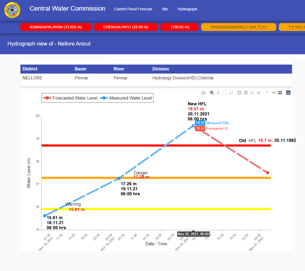 | 3 | Nellore Anicut Pennar | Nellore Andhra Pradesh | 15.91 m 17.28 m | 18.7 m | 30.11.1982 | 19.57 m | 20.11.2021 06:00 hrs | 0.87 m | ~17 hrs | No |