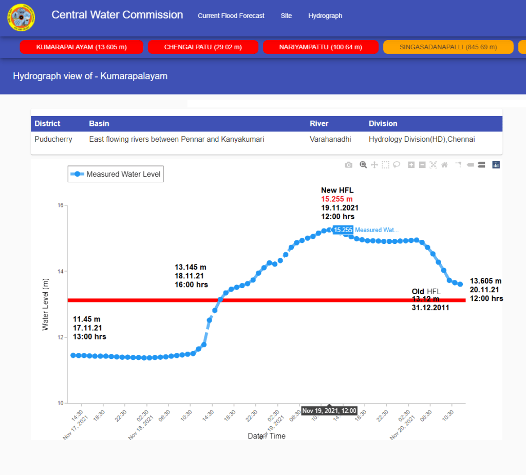 Hydrographs of Varahanadhi river breaching HFL at Kumarapalayam site in Puducherry.