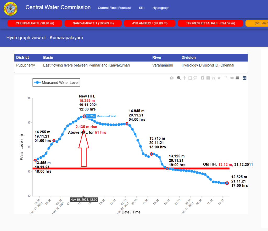 | 13 | Kumarapalayam Varahanadhi | Puducherry | 13.12 m | 31.12.2011 | 15.255 m | 19.11.2021 12:00 hrs | 2.135 m | 51 hrs | Yes | |