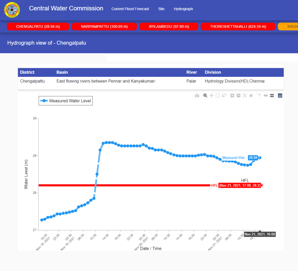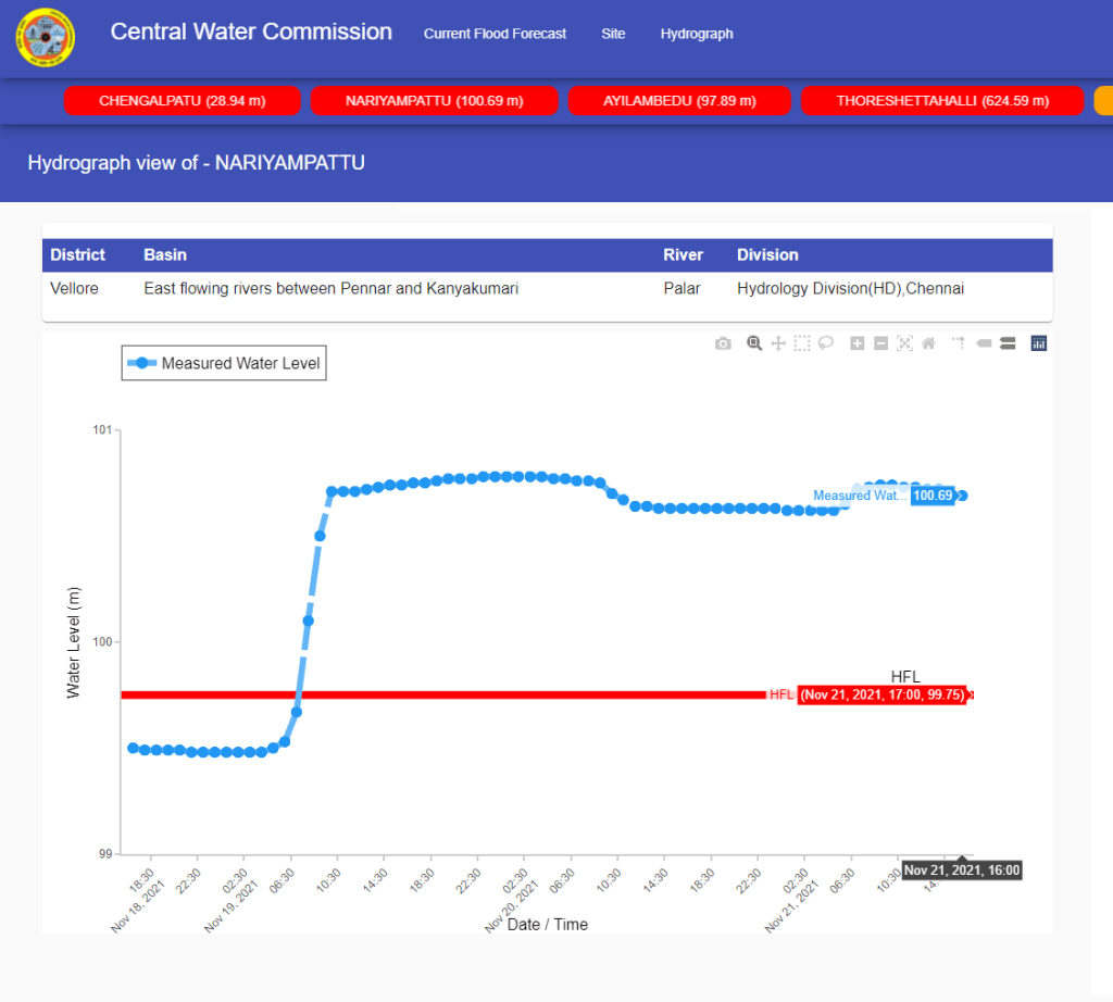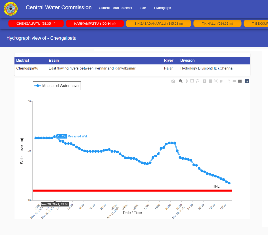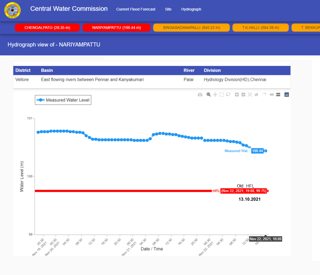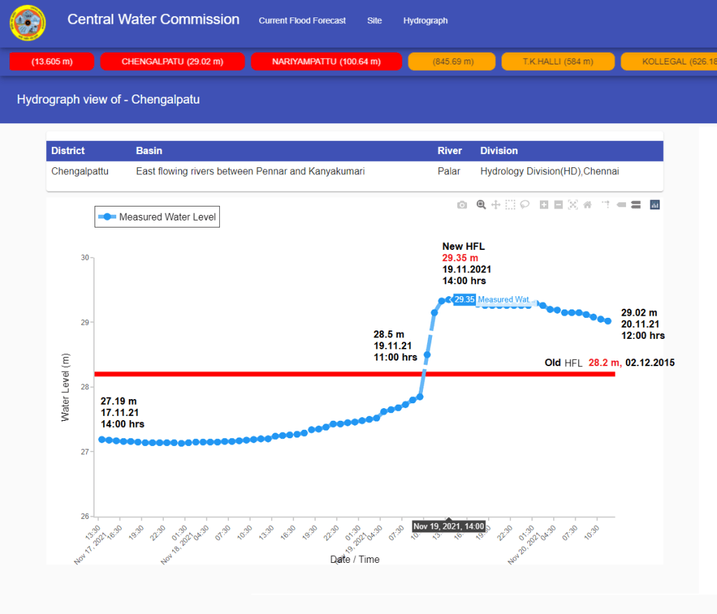 | 12 | Chengalpatu Palar | Chengalpattu Tamil Nadu | 28.2 m | 02.12.2015 | 29.35 m | 19.11.2021 14:00 hrs | 1.15 m | ~84 hrs | Yes | |