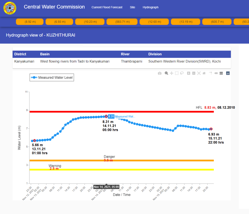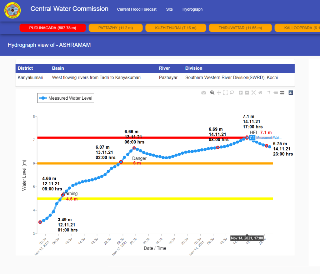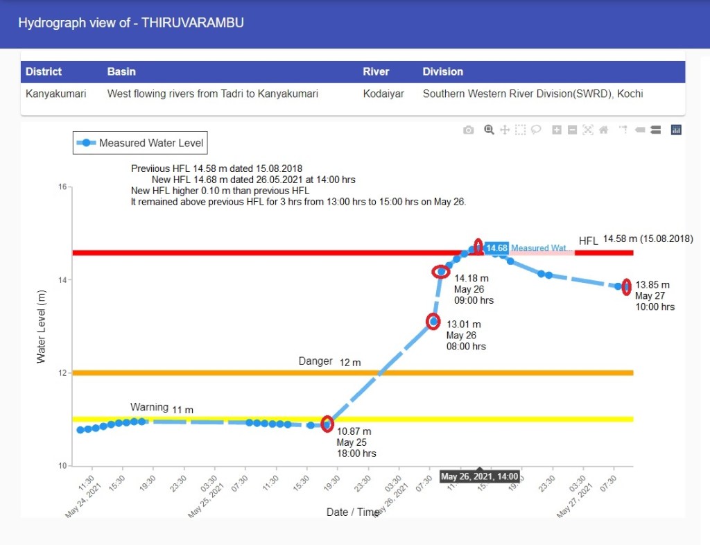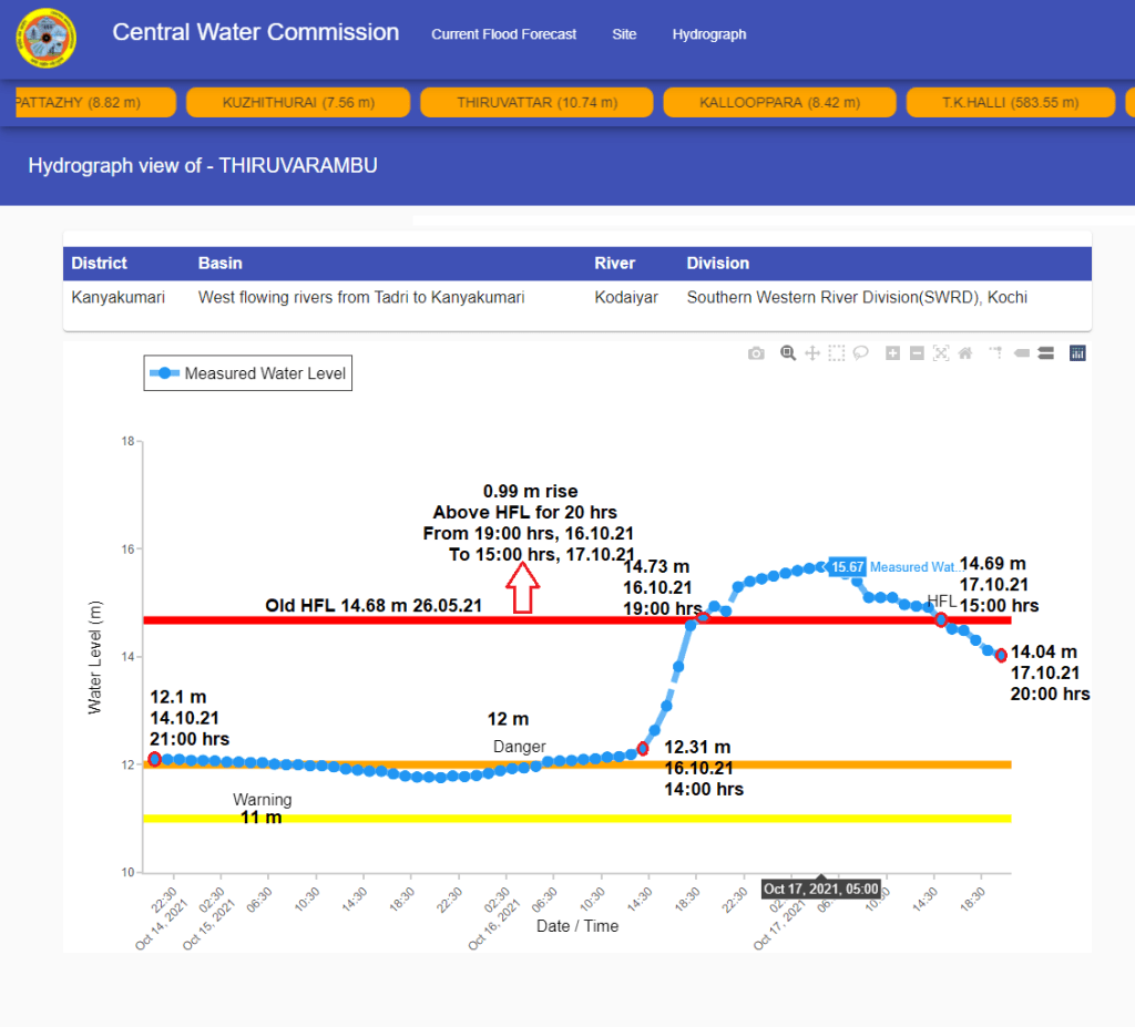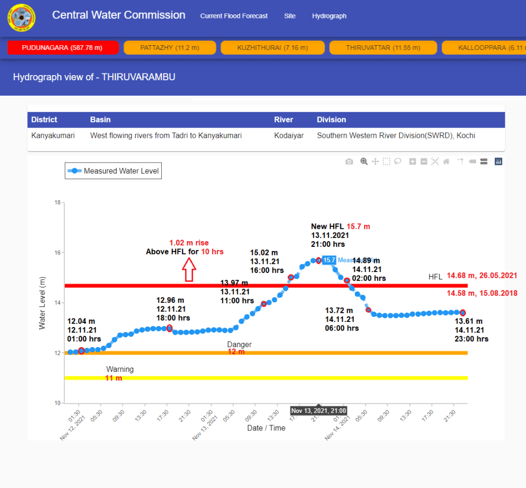 | 1 | Thiruvarambu Kodaiyar | Kanyakumari Tamil Nadu | 11 m 12 m | 15.67 m | 17.10.2021 05:00 hrs | 15.7 m | 13.11.2021 21:00 hrs | 1.02 m | 10 hrs | No |