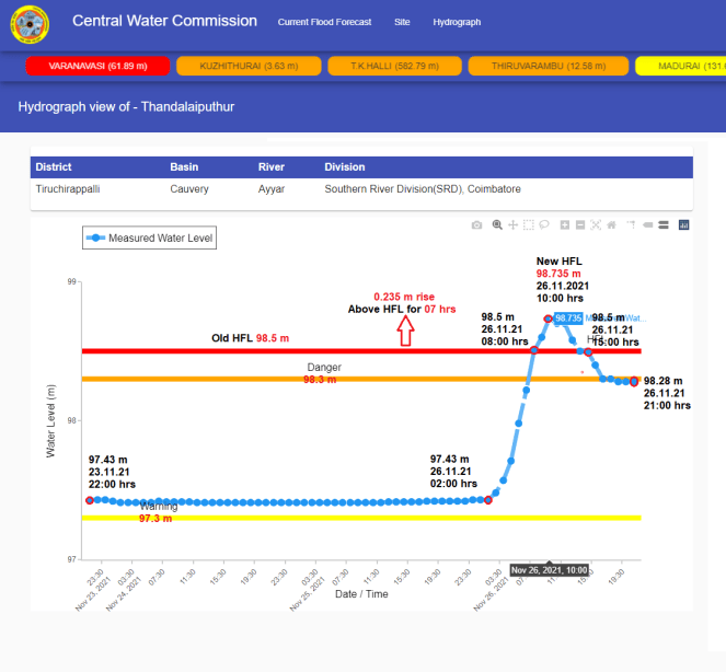 | 3 | Thandalaiputhur Ayyar | Tiruchira-ppalli Tamil Nadu | 97.3 m 98.3 m | 98.5 m | NA | 98.735 m | 26.11.2021 10:00 hrs | 0.235 m | 07 hrs | No |