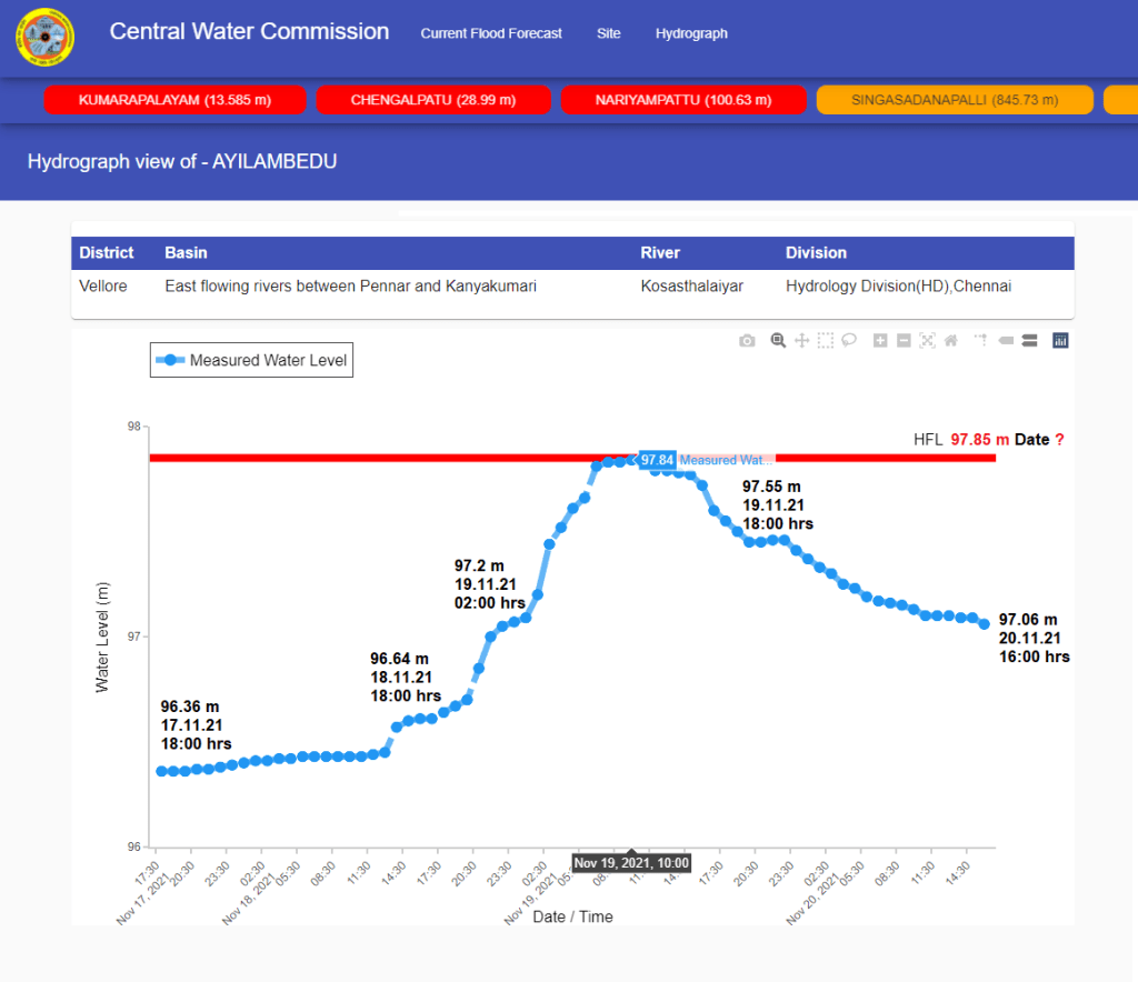 | 8 | Ayilambedu Kosasthalaiyar | Vellore Tamil Nadu | 97.85 m | NA | 97.97 m | 21.11.2021 12:00 hrs | 0.12 m | 07 hrs | Yes | |