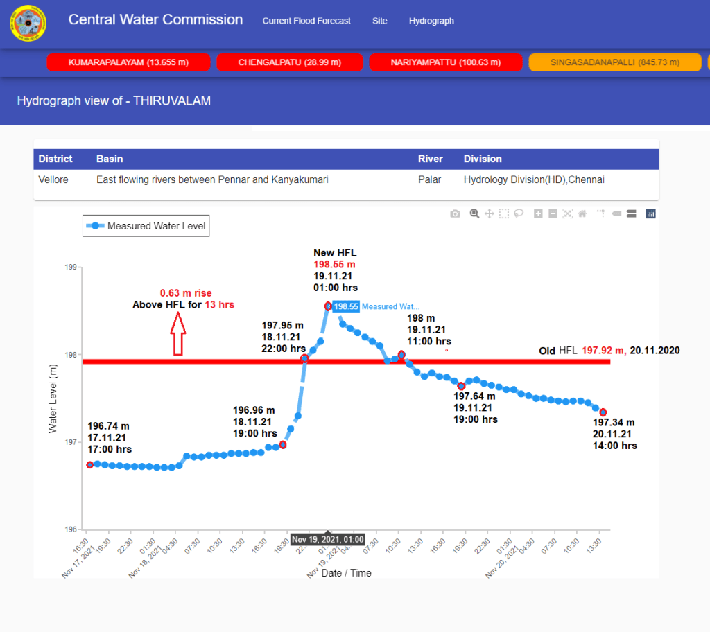 | 4 | Thiruvalam Palar | Vellore Tamil Nadu | 197.92 m | 20.11.2020 | 198.55 m | 19.11.2021 01:00 hrs | 0.63 m | 13 hrs | Yes | |