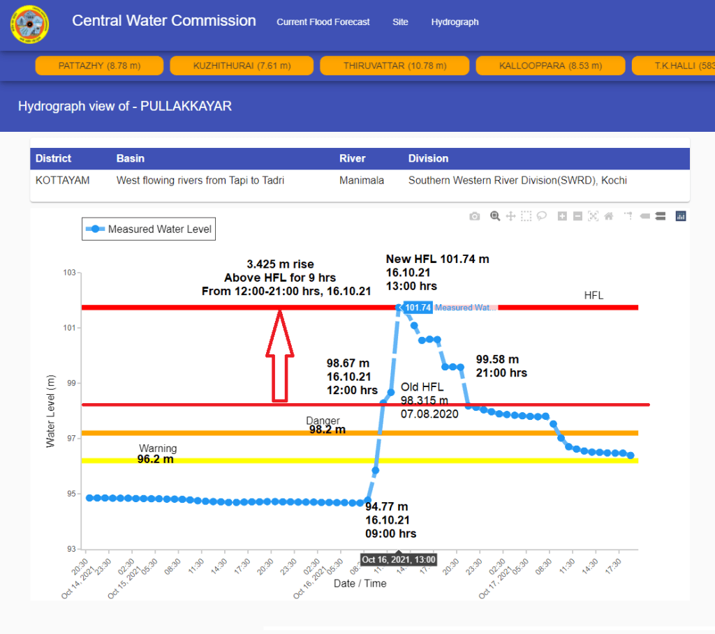 The Manimala river at Pullakkayar site in Kottyam witnessed sudden rise of 3.425 m above old HFL on October 16, 2021.