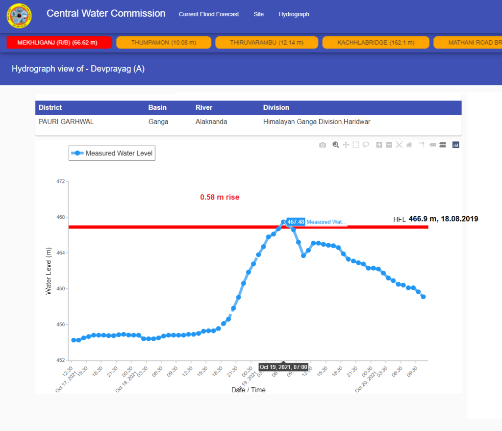 | 2 | Devprayag (A) Alaknanda | Pauri Uttarakhand | 466.9 m | 18.08.2019 | 467.48 m | 19.10.2021 07:00 hrs | 0.58 m | 2 hrs | No | |