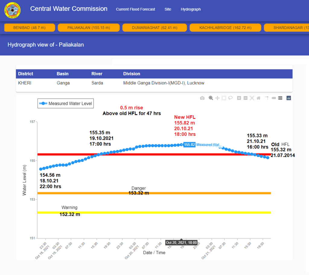 So far, CWC has not updated the new HFL at any of the sites mentioned in the table below. On the contrary, in several cases, it has removed old HFL and dates for these sites. For Paliakalan site in Kheri, CWC has changed Warning Level (WL) from 152.32 m to 153.1 m and Danger Level (DL) from 153.32 m to 154.1 m.