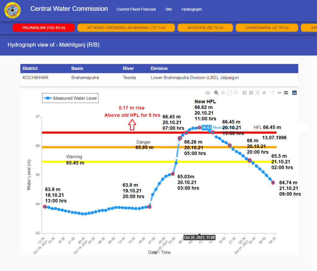 It’s almost after 25 years that Teesta river at Mekhliganj LF site has breached the old HFL that too in later half of October. CWC website has not updated the new HFL readings.