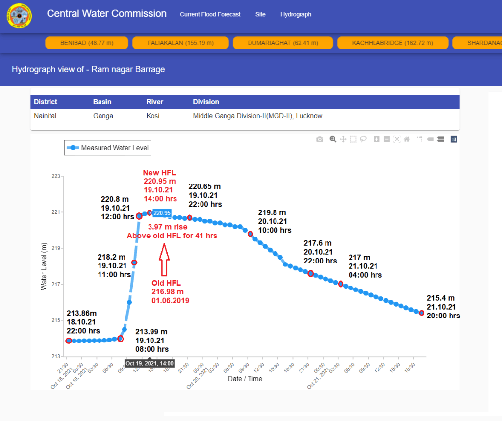 | 6 | Ramnagar Barrage Kosi | Nainital Uttarakhand | 216.98 m | 01.06.2019 | 220.95 m | 19.10.2021 14:00 hrs | 3.97 m | 41 hrs | No | |