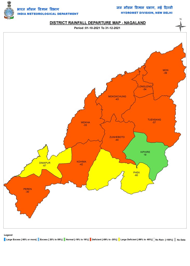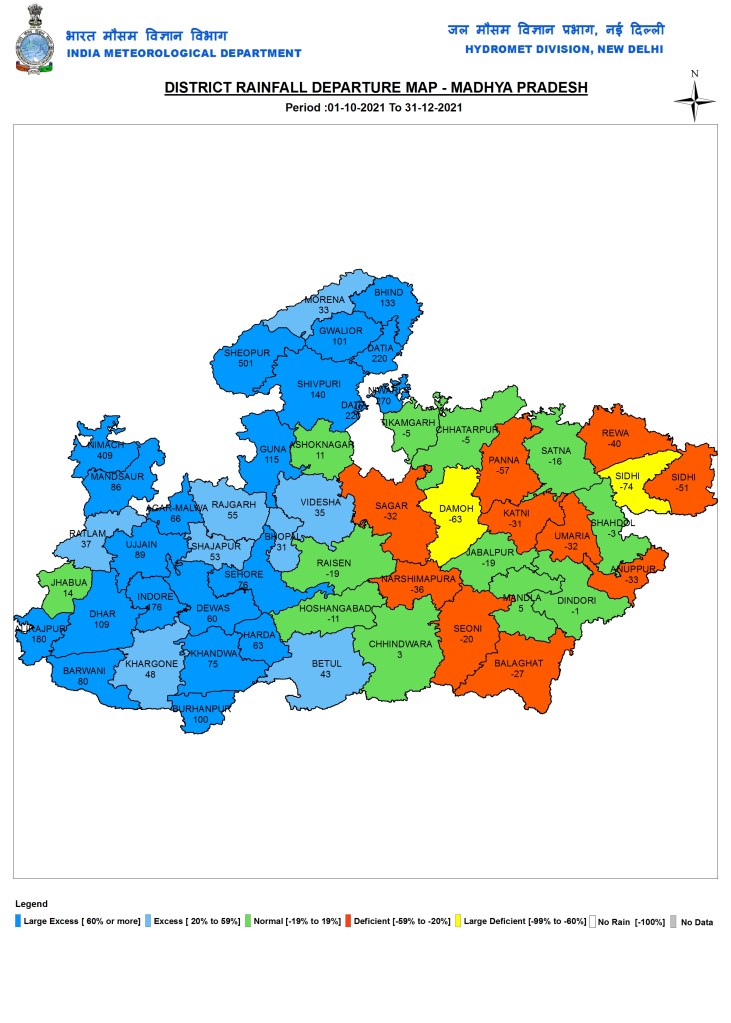 Monthly rainfall The distribution of rainfall for the three months of Post Monsoon 2021 season as per IMD figures is as follows. While the monthly normal and actual rainfall decreases as we go from October to December, the % surplus also decreases and turns into slight deficit by December 2020. There is no evident impact of La Nina here.