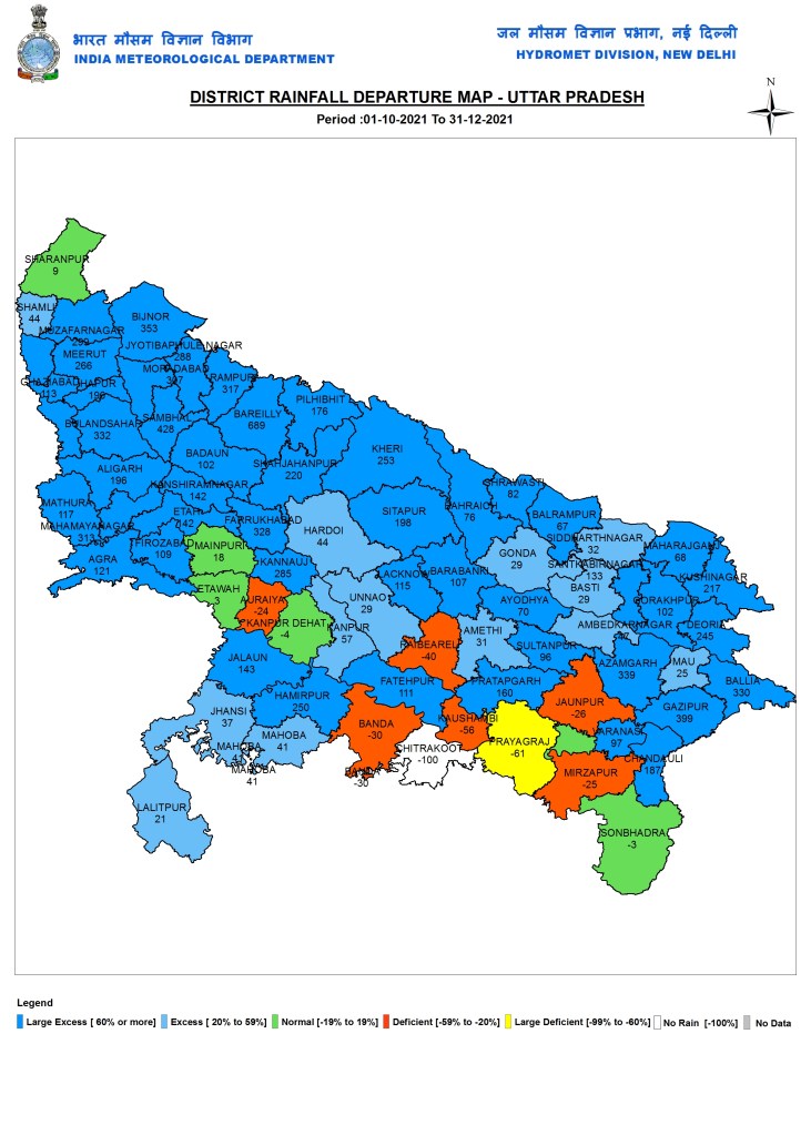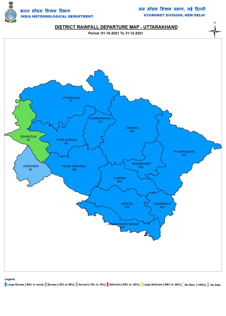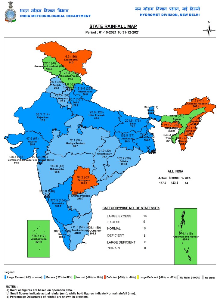 ALL INDIA: State wise rainfall Fourteen States and Union Territories (UTs) had Large Excess Rainfall (more than 60% above Long Period Average or LPA), 9 had Excess (20-59% above LPA), 6 had normal (19% below to 19% above normal) and 8 states and UTs had Deficit Rainfall (20 to 59% below normal) during Oct Dec 2021 period in India. Here LPA is Long period average, taken as average of the rainfall during 1961-2010. Ladakh had the highest deficit at 56%. Pondicherry had the highest rainfall at 1425.1 mm, way above the 2nd highest rainfall in Tamil Nadu at just above 700 mm. Uttarakhand had the highest surplus % at 263%.