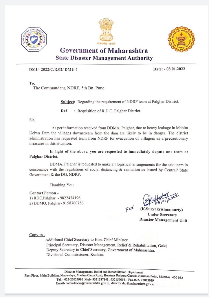 A letter sent by Under Secretary (Disaster Management Unit) K Suryakrishnamurty to the NDRF Commandant, 5th Battalion, Pune on Saturday stated: “As per information received from District Disaster Management Authority, Palghar, due to heavy leakage in Mahim Kelwa dam, the villages downstream from the dam are likely to be in danger. The district administration has requested team from NDRF for evacuation of villagers as a precautionary measure in this situation. In light of the above, you are requested to immediately depute one team at Palghar district.”[iii]