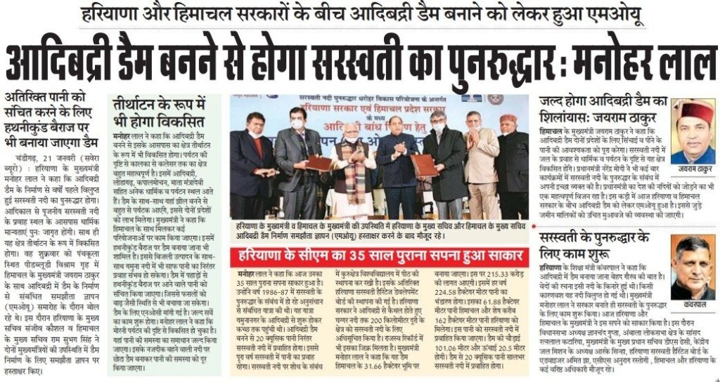Haryana Govt to construct dam in Himachal for reviving Saraswati Shocking: The Haryana Government will construct a dam and a reservoir on 77 acres in Himachal Pradesh near Yamunanagar district’s Adi Badri area, which is situated on the border of Himachal Pradesh. The Haryana Government will spend Rs 215.33 crore on this project and a memorandum of understanding (MoU) will be signed by Haryana and Himachal Pradesh Governments in the presence of Haryana CM Manohar Lal Khattar and Himachal CM Jai Ram Thakur in Panchkula on January 21. https://www.tribuneindia.com/news/haryana/haryana-to-construct-dam-in-hp-for-reviving-saraswati-362760 (20 Jan. 2022)