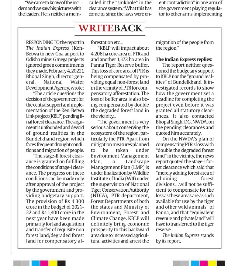 Ken Betwa Linking Cabinet set deadline for Ken-Betwa link before it got clearances in place EXCELLENT report that shows how little respect this government has for the environmental norms or the people. https://indianexpress.com/article/express-exclusive/environment-clearance-violation-cabinet-set-deadline-for-ken-betwa-link-before-it-got-clearances-in-place-7755887/ (04 Feb. 2022) Some more details here: https://indianexpress.com/article/express-exclusive/ken-betwa-link-to-new-goa-airport-to-odisha-mine-6-mega-projects-ignore-green-commitments-they-made-7755848/ (05 Feb. 2022)