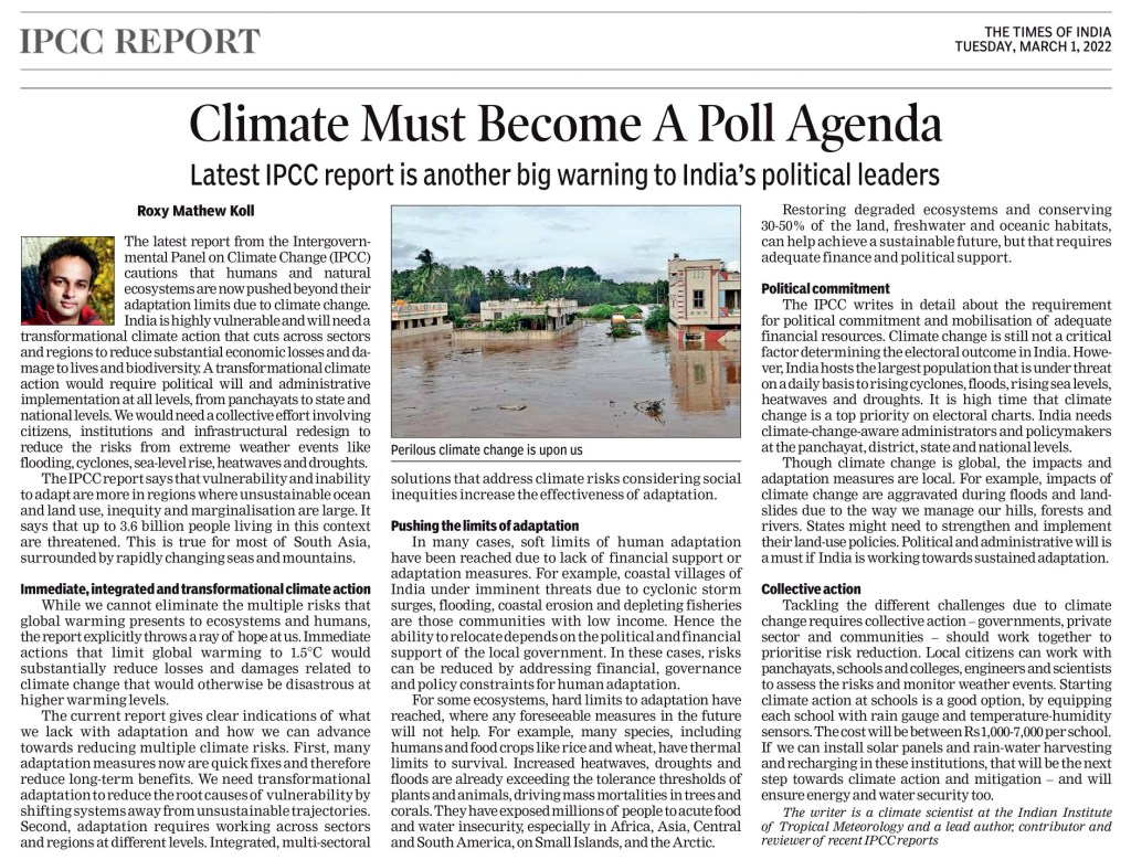 Opinion Climate must become a poll agenda: Latest IPCC report is another big warning to India’s political leaders by Roxy Koll https://timesofindia.indiatimes.com/blogs/toi-edit-page/climate-must-become-a-poll-agenda-latest-ipcc-report-is-another-big-warning-to-indias-political-leaders/ (28 Feb. 2022)