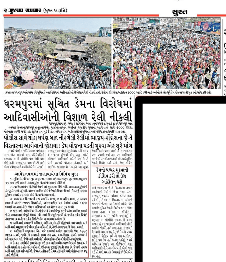 Gujarat Thousands of tribals gather on Monday, Feb 28, 2022 to oppose the proposed dam in Dharampur, Valsad district of Gujarat. Even some Congress and BJP leaders also joined and warned the govt against going ahead with the dam. (Gujarat Samachar March 1 2022)