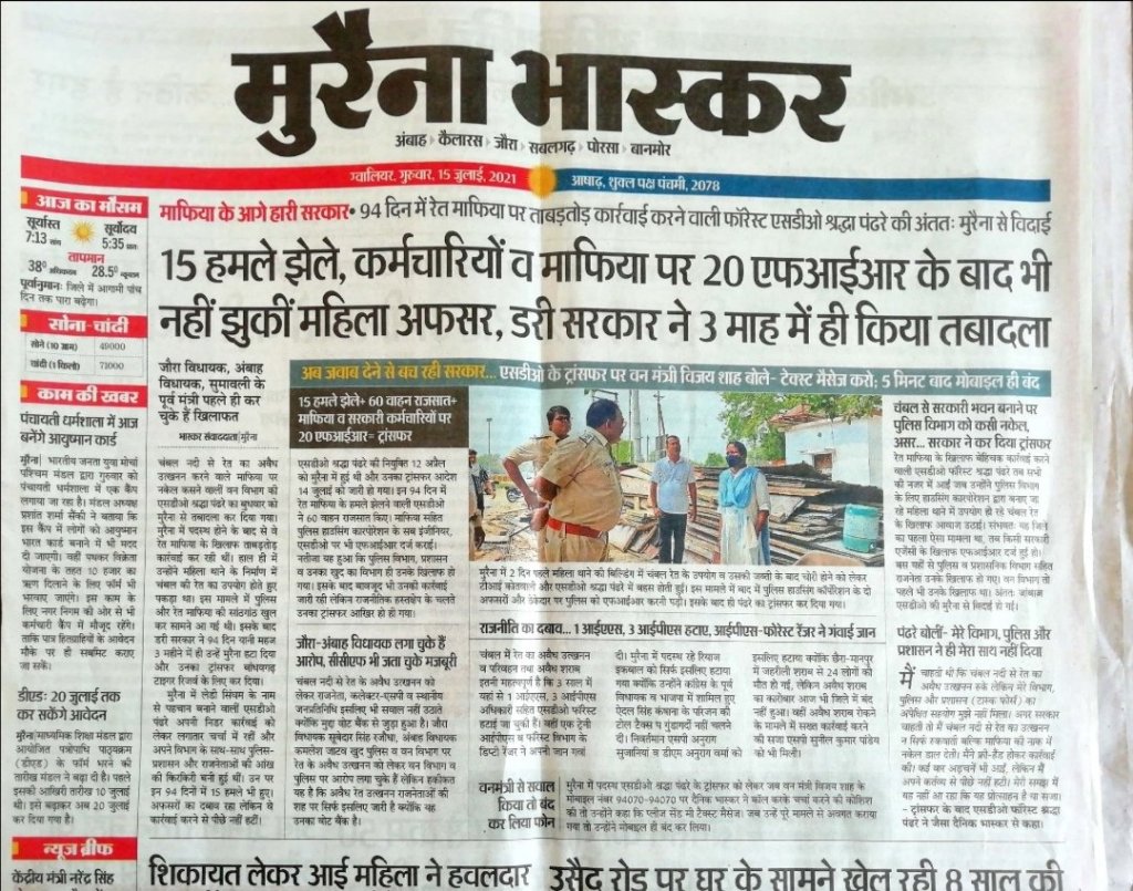 Shardha Pandre, SDO, Forest Department, Morena alone survived 9 lethal attacks in just two months. She headed several raids to bust illegal sand mining operations before she was transferred. The incident of Khargone where 6 reporters were booked by administration for covering illegal sand mining further proves collapse of governance in the state.
