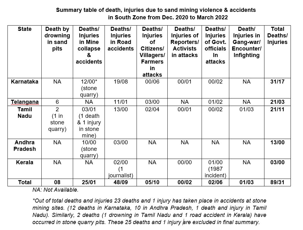 Annually scores of Indian people have been meeting untimely deaths and suffering injuries due to violence and accidents associated with unregulated sand mining activities. We have compiled zone wise detailed reports on human toll of sand mining for the period between December 2020 and March 2022. The reports for North, East and North East and West zones have been published. This is fourth and last summary report of detailed file attached here on the issue for South zone covering Karnataka, Telangana, Tamil Nadu and Kerala states. We did not come across any report on the subject from Union Territory of Puducherry for this period.