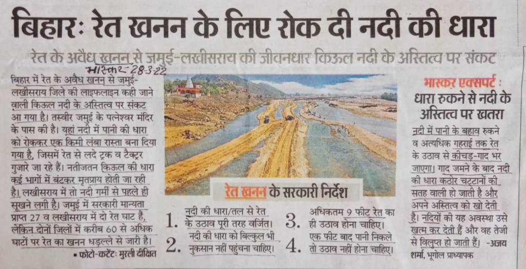 जमुई और लखीसराय में बालू अवैध खनन बदस्तूर जारी है। बंदोबस्ती के बाद जमुई में 27 तो लखीसराय में दो घाटों से खनन की मंजूरी मिली है। लेकिन इन 27 वैध बालू घाटों के अलावा दोनों जिलों में करीब तीन दर्जन अवैध बालू घाटों से खनन हो रहा है। वैध-अवैध मिलाकर दोनों जिलों में 65 घाटों से खनन हो रहा है। जिससे दोनों जिलों की लाइफलाइन कही जाने वाली किऊल नदी के अस्तित्व पर खतरा मंडरा रहा है। भास्कर टीम ने दोनों जिलों में खनन की पड़ताल की, जिसमें पाया कि जमुई में अवैध घाटों की संख्या 25 के करीब है। एनजीटी से इन घाटों से उठाव की मंजूरी नहीं मिली है। लेकिन इसके बाद भी यहां से बालू का उठाव हो रहा है। https://www.bhaskar.com/local/bihar/bhagalpur/jamui/news/the-lifting-is-happening-from-65-the-police-station-is-half-a-kilometer-away-still-no-action-129570465.html (28 March 2022)