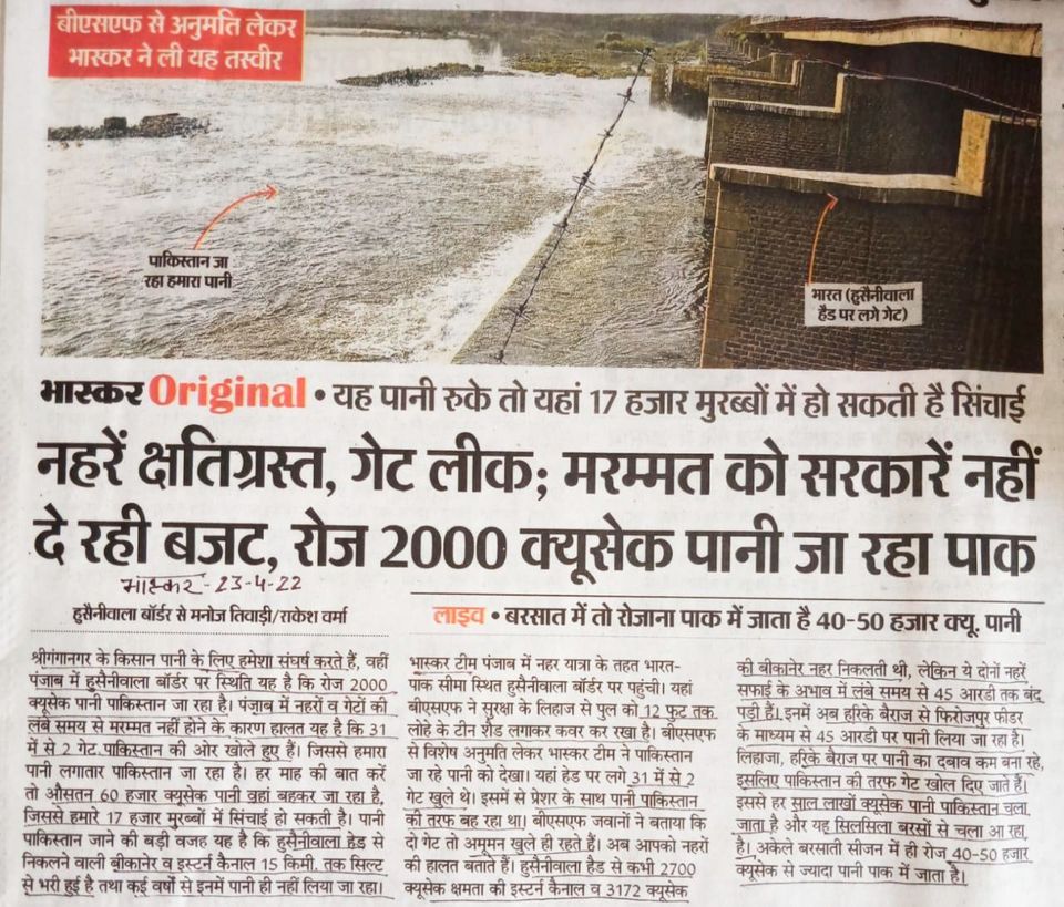 Punjab According to this Dainik Bhaskar report of Apr 23, 2022, about 2000 cusecs of water is being released through two (of 31) gates of Hussainiwala barrage in Punjab all the time. This water is flowing into Pakistan. The reason is that the the Bikaner (capacity 3172 cusecs) and Eastern (capacity 2700 cusecs) Canals that start from the Hussainiwala barrage are silted uptil RD 45, and no water is flowing in these canals till RD45. At RD 45, the canals get water from Harike barrage, according to this report.