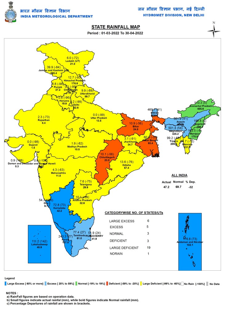 Below normal rainfall in March-Apr 2022 in most stages except a few in South India and North East India. https://timesofindia.indiatimes.com/india/pre-monsoon-rain-deficit-in-20-states/articleshow/91086038.cms (26 April 2022)
