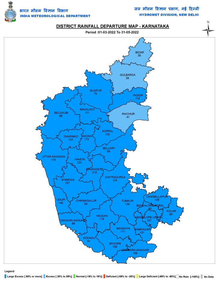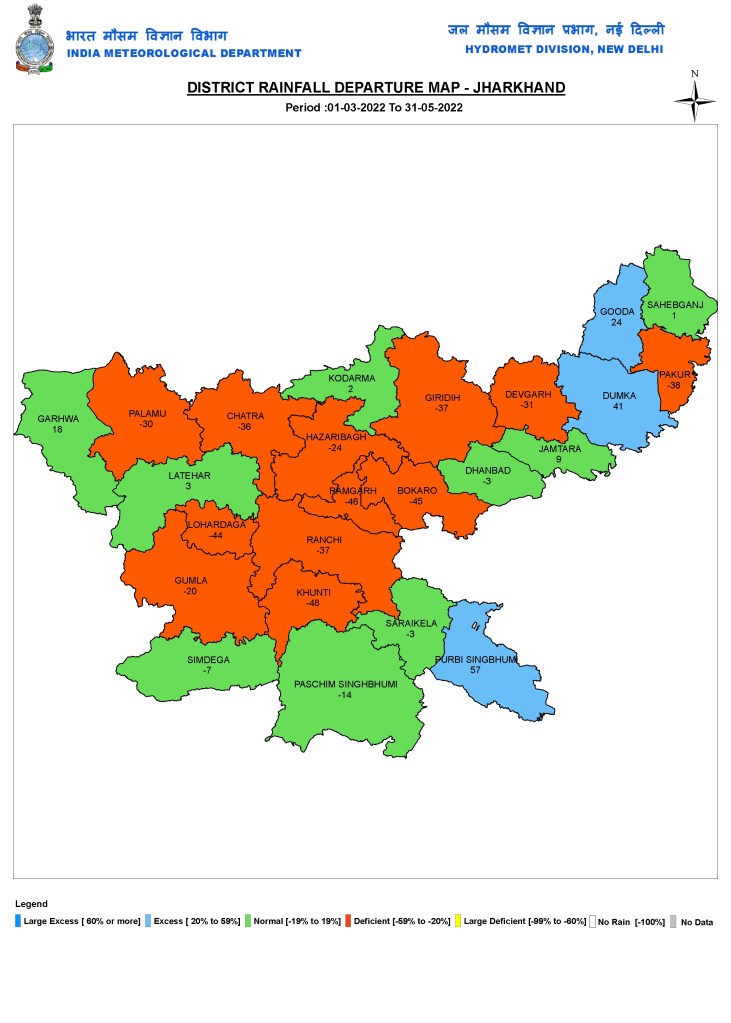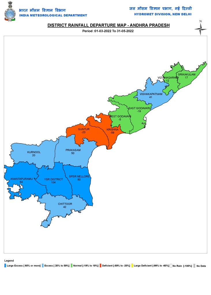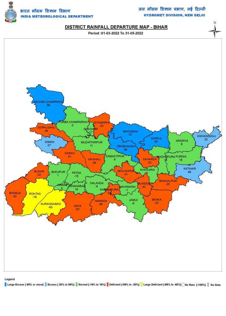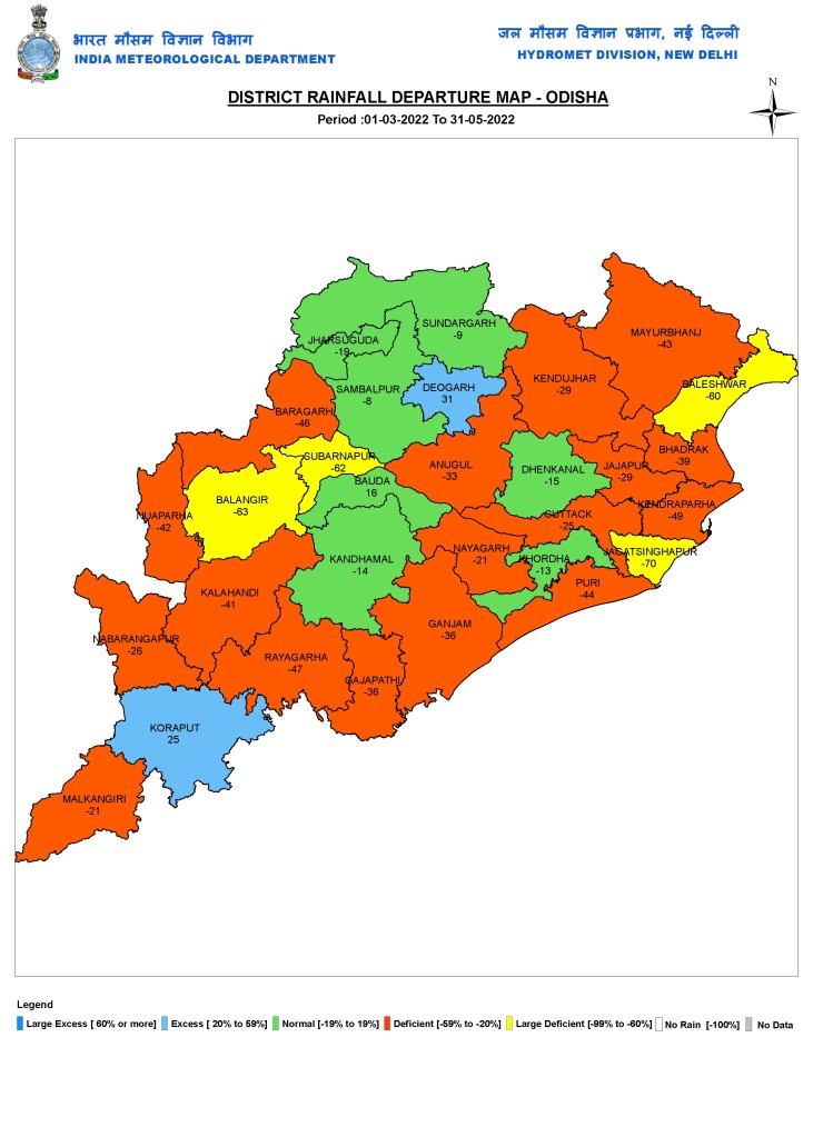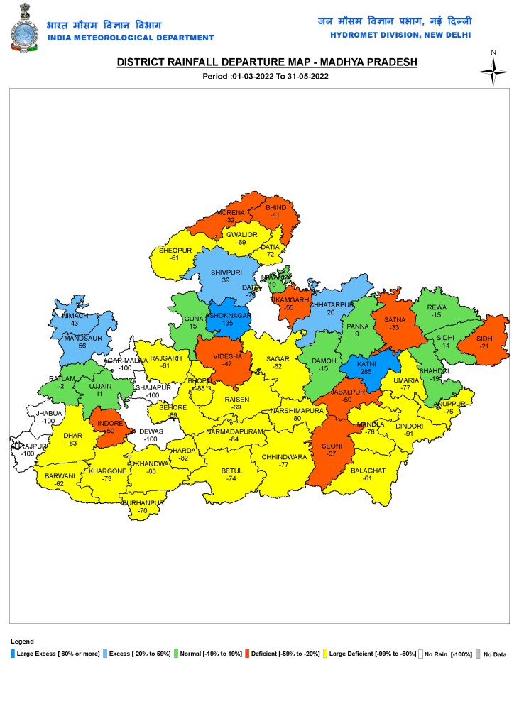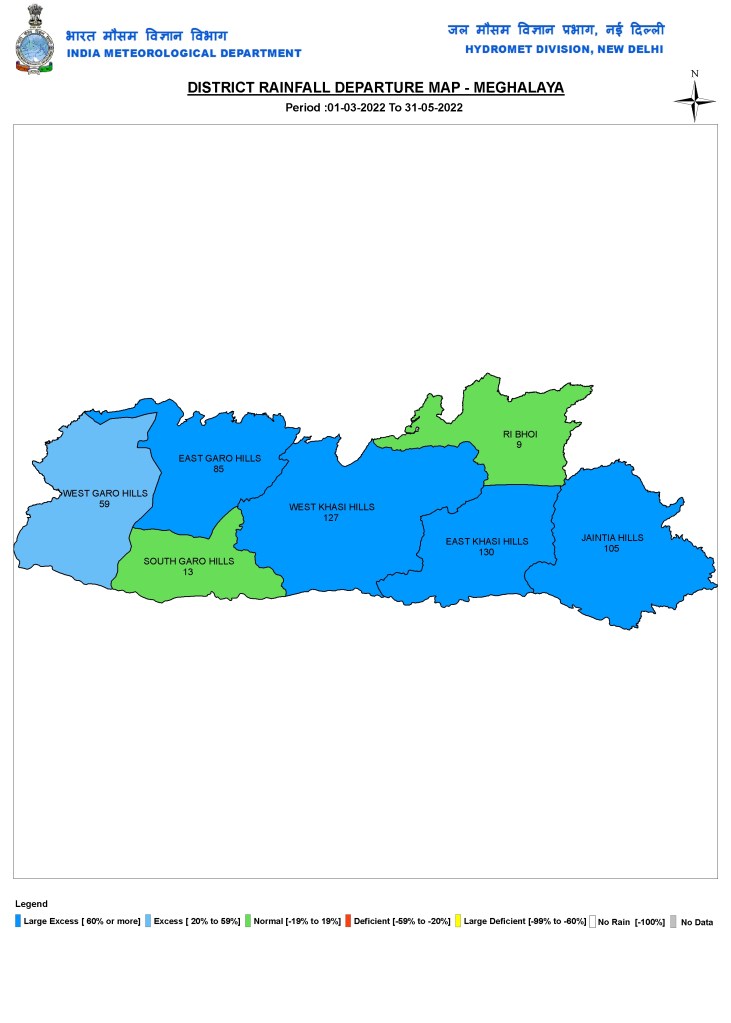 ALL INDIA Sub Division wise Rainfall distribution As can be seen from the IMD map below, out of 36 meteorological sub divisions of IMD, Six had large Excess, Four had Excess, Eight had Normal, Ten had deficit rainfall and eight had large deficit rainfall in pre monsoon 2022 season.