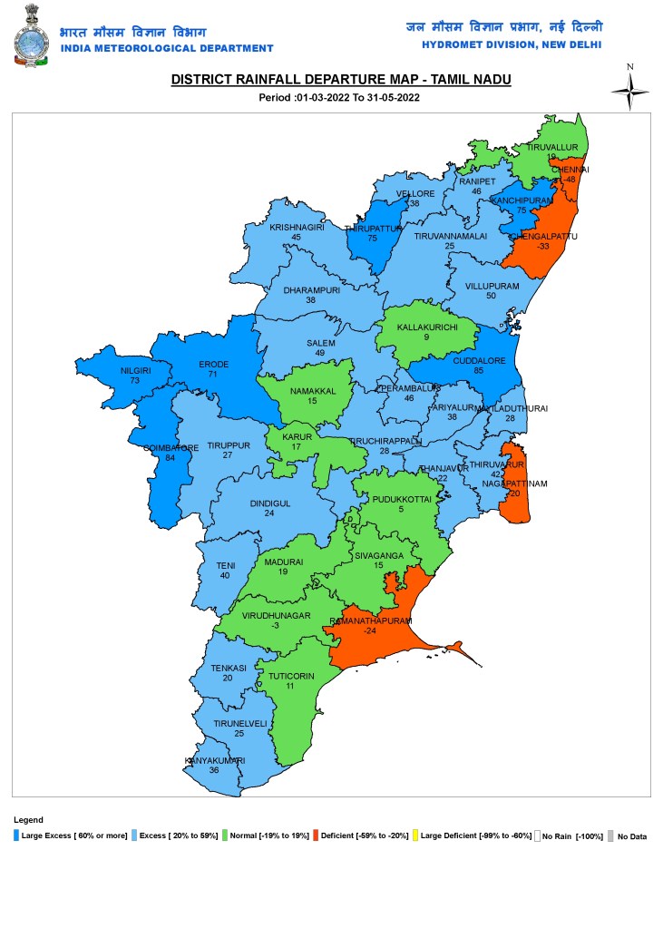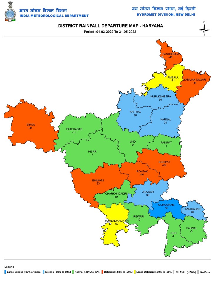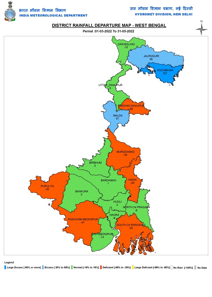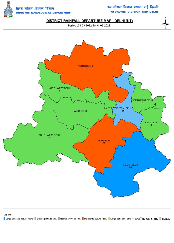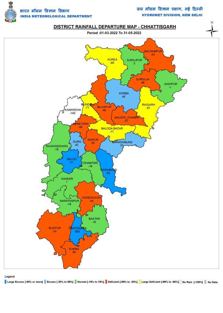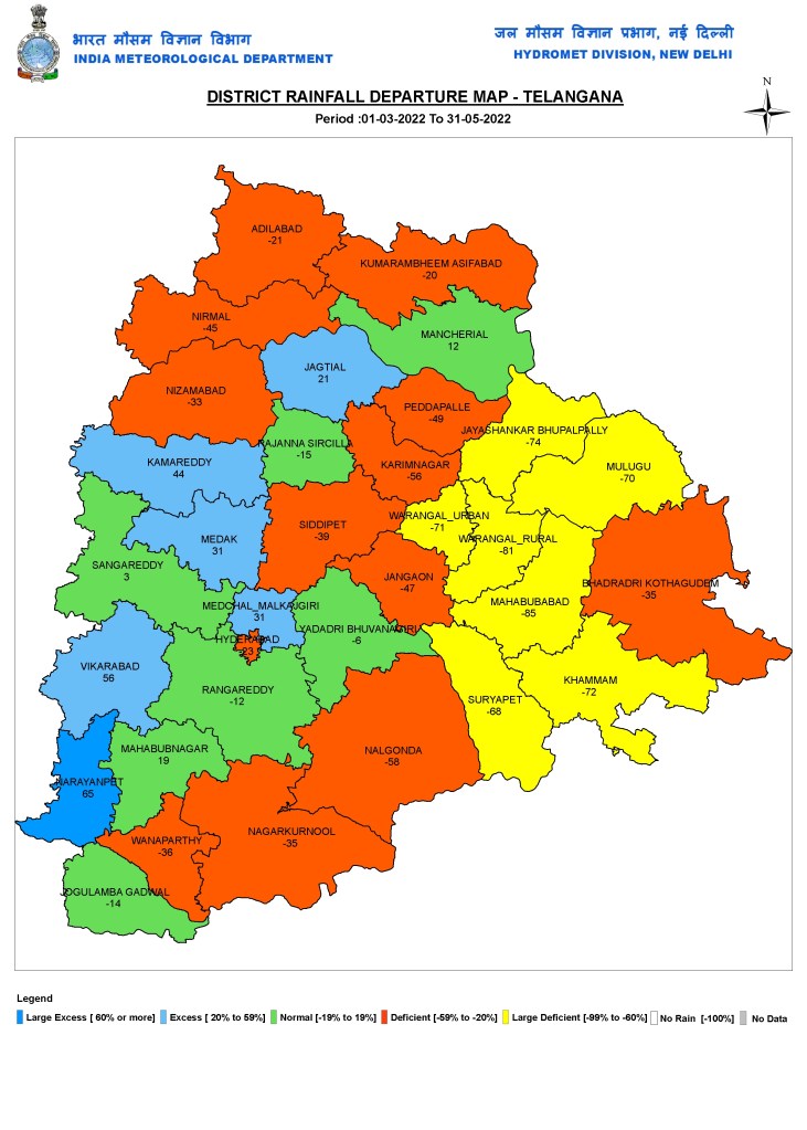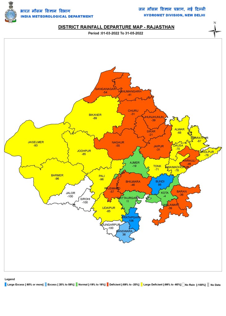ALL INDIA Sub Division wise Rainfall distribution As can be seen from the IMD map below, out of 36 meteorological sub divisions of IMD, Six had large Excess, Four had Excess, Eight had Normal, Ten had deficit rainfall and eight had large deficit rainfall in pre monsoon 2022 season.