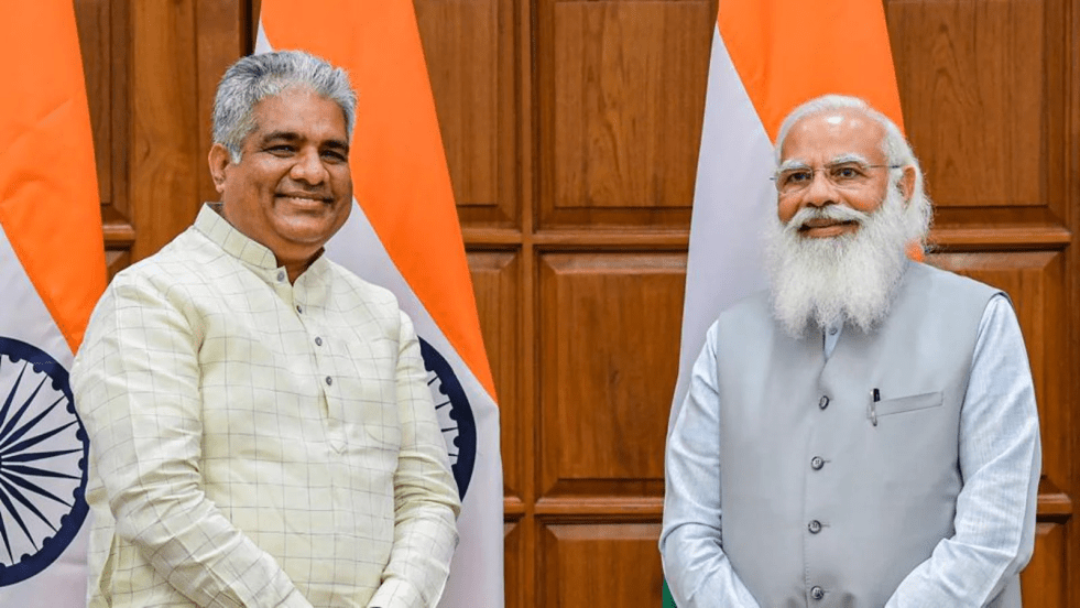 (Feature image: Union Environment Minister Bhupender Yadav with PM Narendra Modi before taking oath on July 7, 2021 PTI/HT.)
