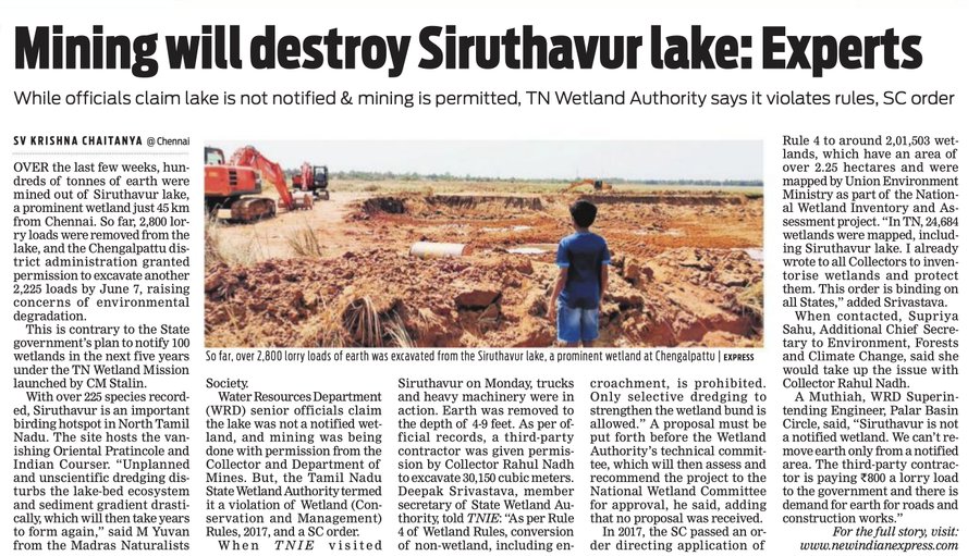 Chennai Mining will destroy Siruthavur lake near Chennai: Experts Over the last few weeks, hundreds of tonnes of earth was mined out of Siruthavur lake, a prominent wetland just 45 km from Chennai. So far, 2,800 lorry loads were removed from the lake, and the Chengalpattu district administration granted permission to excavate another 2,225 loads by June 7, raising concerns of environmental degradation.