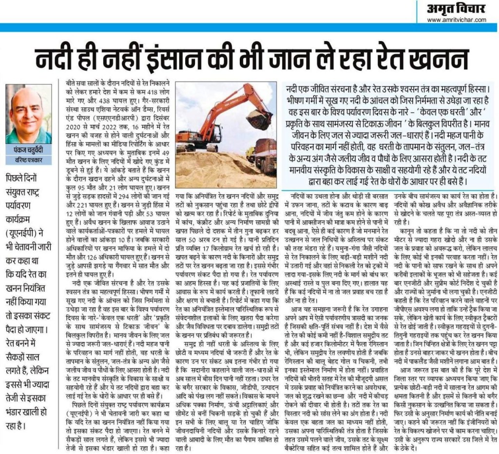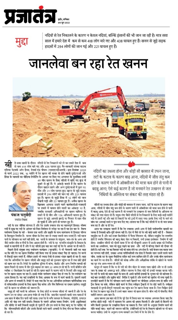 नदी ही नहीं इंसान की भी जान ले रहा रेत खनन Good to see Pankaj Chaturvedi blog and articles in Hindi and Urdu highlighting human casualties and violence due to illegal sand mining in the country following SANDRP’s detailed reports on the same. बीते सवा सालों के दौरान नदियों से रेत निकालने को ले कर हमारे देश में कम से कम 418 लोग मारे गए और 438 घायल हुए। गैर-सरकारी संस्था साउथ एशिया नेटवर्क ऑन डैम्स, रिवर्स एंड पीपल (एसएएनडीआरपी) द्वारा दिसंबर 2020 से मार्च 2022 तक, 16 महीने में रेत खनन की वजह से होने वाली दुर्घटनाओं और हिंसा के मामलों का मीडिया रिपोर्टिंग के आधार पर किए गए अध्ययन के मुताबिक इनमें 49 मौत खनन के लिए नदियों में खोदे गए कुंड में डूबने से हुई हैं।