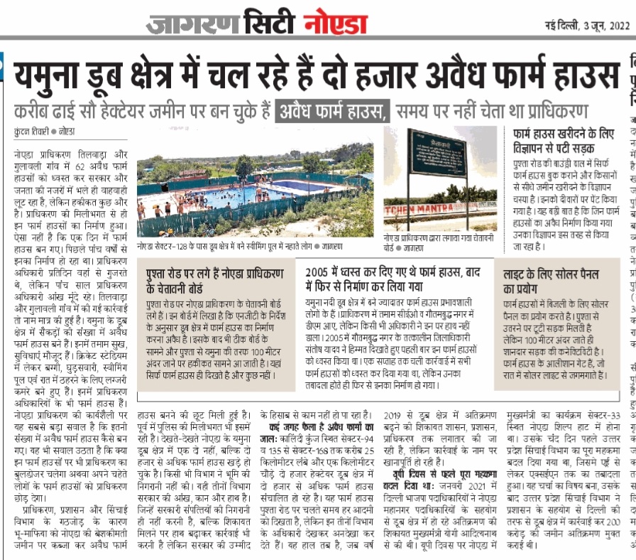 Noida Authority’s officer on special duty (OSD) Prasun Dwivedi said around 75 farmhouses have been demolished in the past three months, occupying 1.5 lakh square metres of land, with as many as 62 farmhouses demolished in Tilwara and Gulavali villages on Wednesday alone. The official added that several other illegal farmhouses have also been identified and will be demolished in the coming days. https://timesofindia.indiatimes.com/city/noida/on-yamuna-hindon-edges-scores-of-farmhouses-polluting-industries/articleshow/91976664.cms (03 June 2022)
