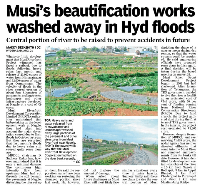 4. Hyderabad River front project shelved The Telangana government has shelved the Musi Rejuvenation and Beautification Project despite spending crores on the much-publicised venture, and annually paying Rs 3.15 crore as salary to employees of Musi Riverfront Development Corp Ltd (MRDCL) for six years. The decision to abandon the project “for the time being” came after MRDCL board of directors met on August 28, 2021. It came in the wake of Rs 2-crore expenditure incurred by the corporation on river development works getting washed away in recent incessant rains. Citing urban flooding occurring every year, authorities said they would go ahead with the riverfront project only after preparing DPR. https://www.deccanchronicle.com/nation/current-affairs/140921/government-shelves-musi-riverfront-development-project.html (15 Sep 2021) Despite forming MRDCL and earmarking Rs 1,665 crore, the nodal agency has neither diverted effluents nor removed encroachments from the banks till date. https://www.deccanchronicle.com/nation/politics/140221/musi-could-finally-see-some-development.html (15 Feb. 2021)