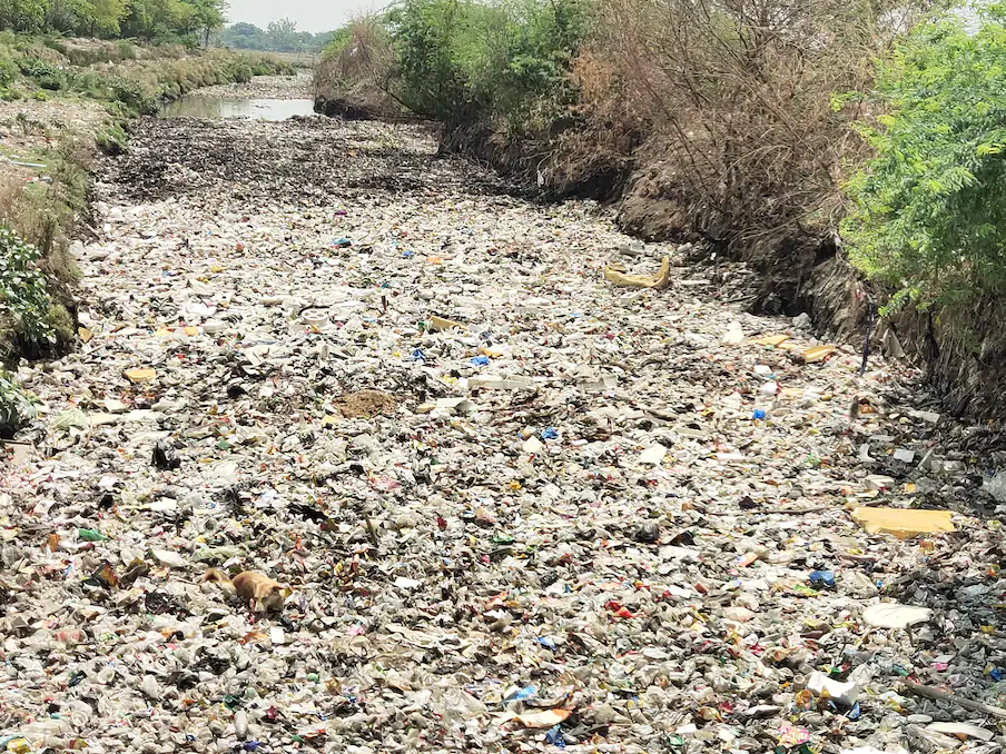 (Feature Image:- A drain choked with solid waste and untreated effluents running through Yamuna floodplains in Mathura. Source: News 18, 13072022.)