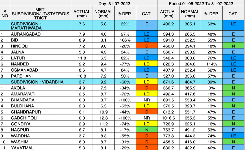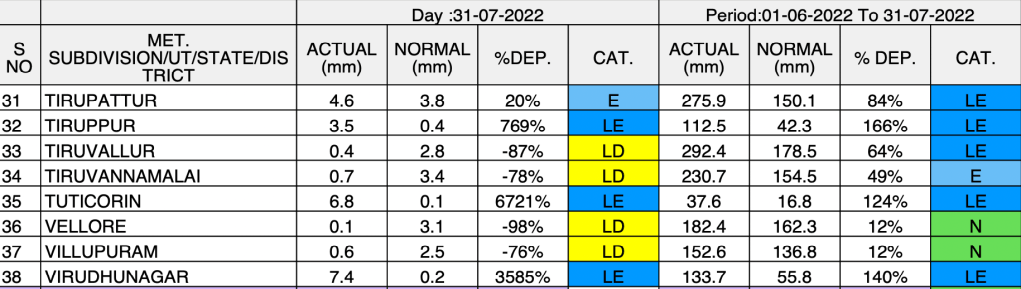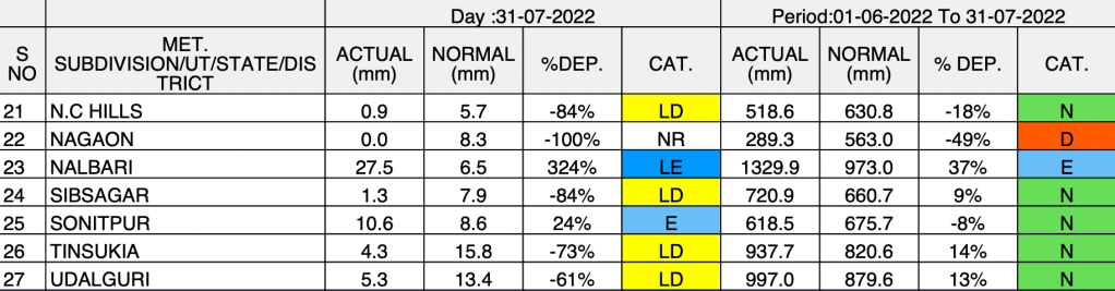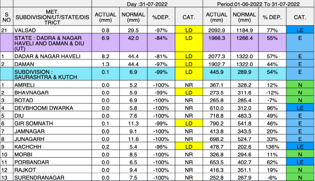 We normally provide the district wise, state wise rainfall using maps downloaded from India Meteorology Department (IMD), but this time, IMD website did not have these maps for almost five days from July 29 to Aug 3 and since IMD does not save the daily rainfall maps in archives in public domain, we are unable to provide the maps for June July 2022 rainfall. Instead, we are providing the figures in tabular figures, also from IMD website.