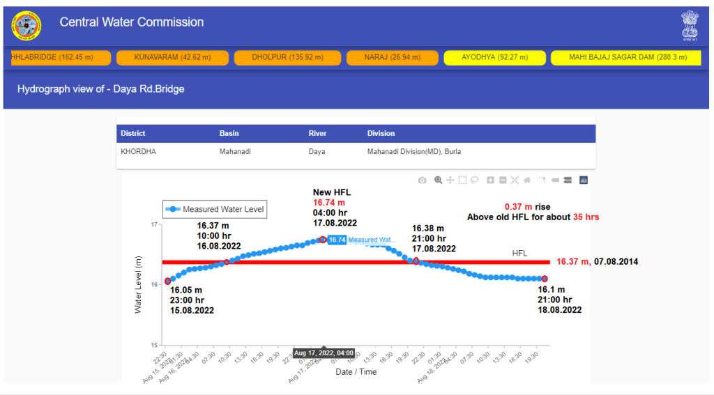 5. River Daya in Mahanadi Basin at Daya road bridge level monitoring site in Khordha district has breached previous HFL 16.37 m attained on 07.08.2014.