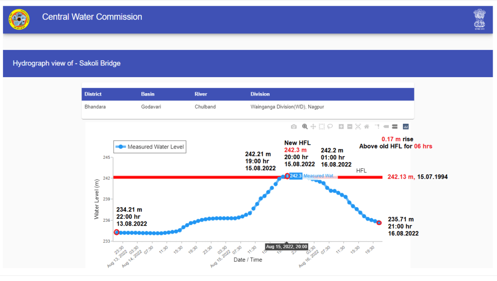 Maharashtra River Chulband in Godavari Basin at Sakoli Bridge level monitoring site has crossed old HFL 242.13 m dated 15.07.1994.