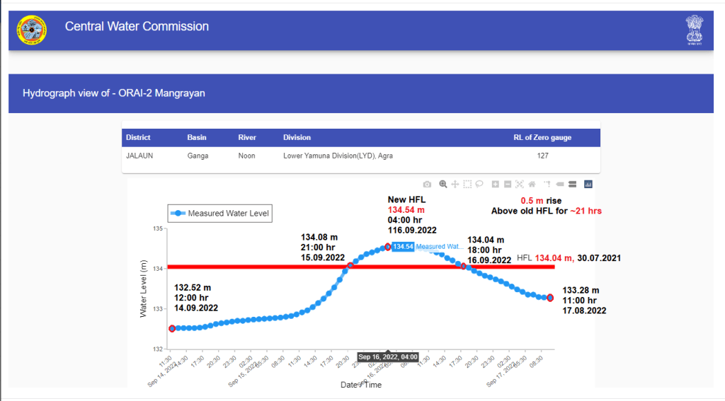 Uttar Pradesh River Noon at Orai 2 Magrayan level monitoring site in Jalaun district has breached old HFL 134.04 m (dated 30.07.2021) at 21:00 hour on 15.09.2022 and probably set 134.54 m as new HFL at 05:00 hour on 16.09.2022. Present flood level is 134.5 m at 10:00 hour on 16.09.2022 with falling trend.