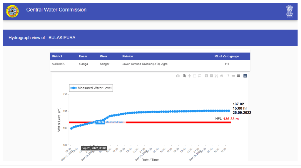 River Sengar in Yamuna basin at Bulakipura level monitoring station in Auraiya district has breached old HFL 136.33 m (dated 19.09.2019) at 03:00 hour on 23.09.2022. Present flood level is 136.73 m at 11:00 hour on 23.09.2022 with rising trend.