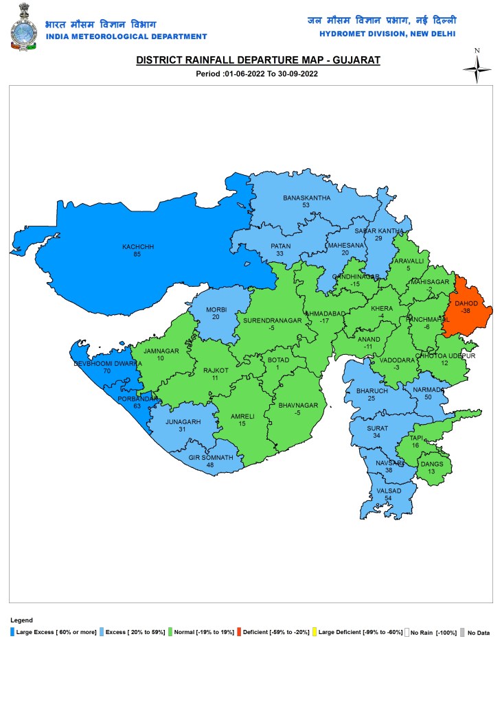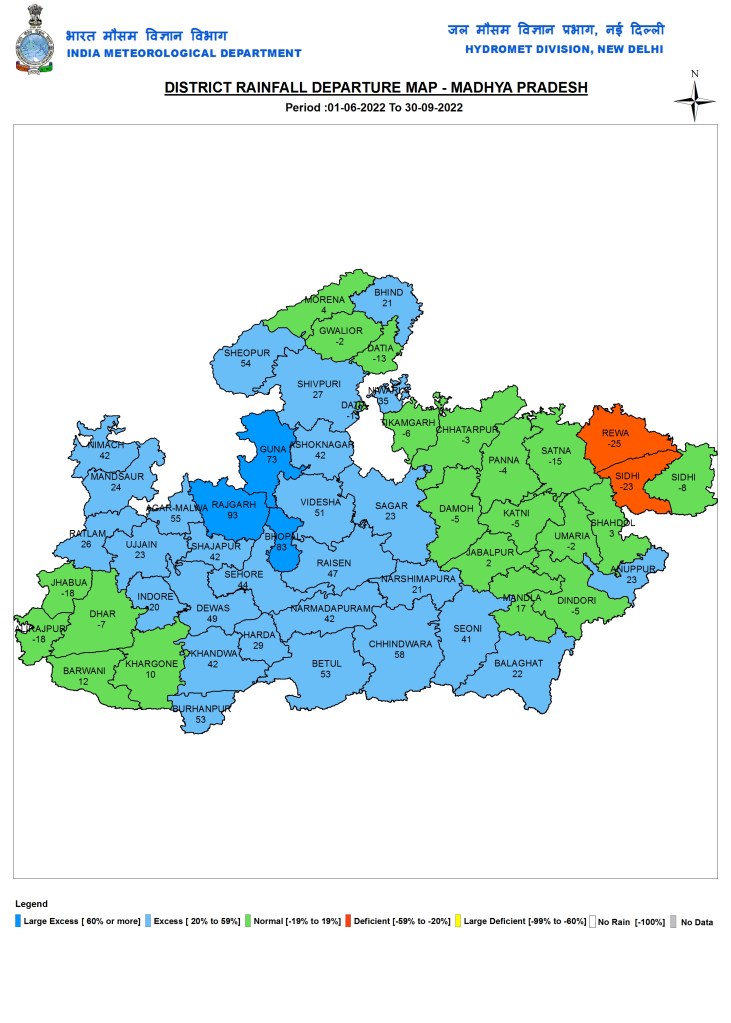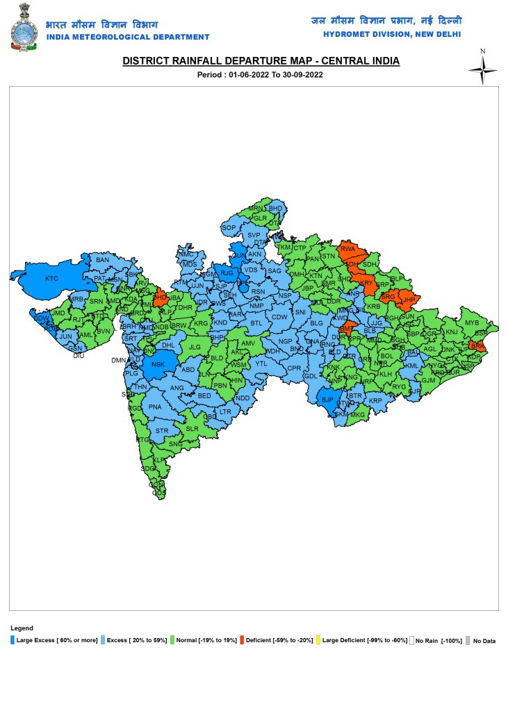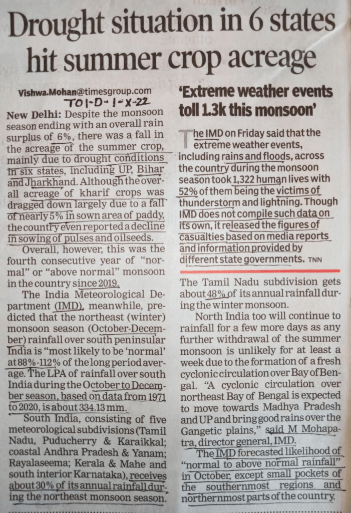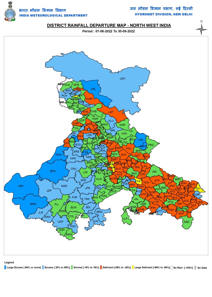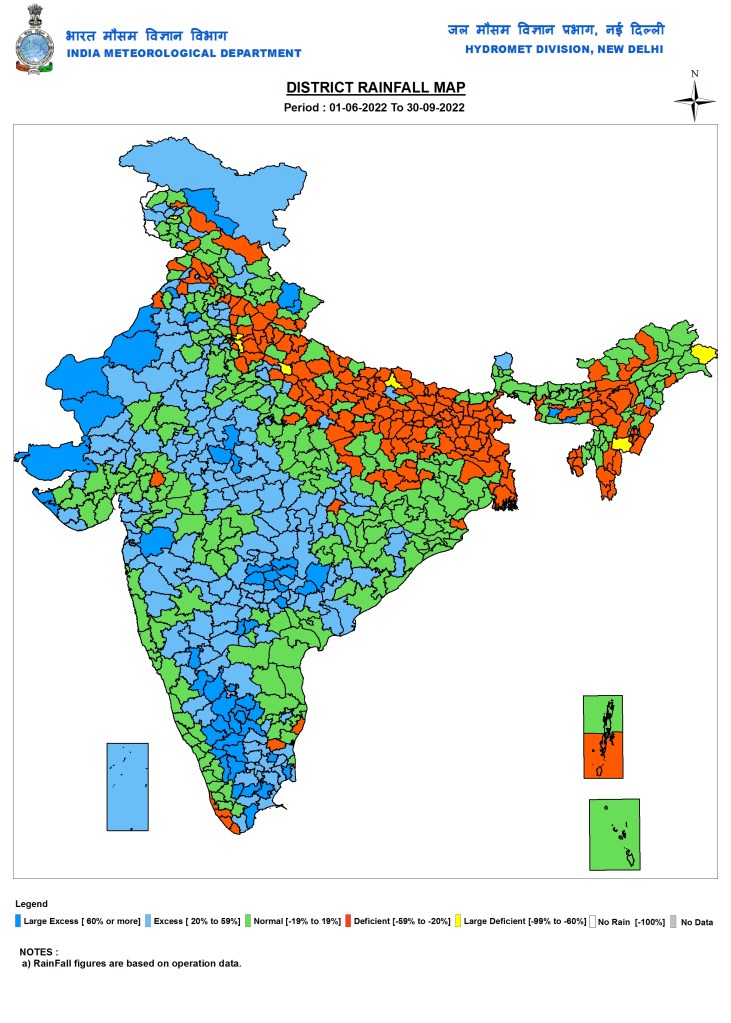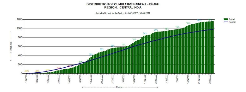 In the just concluded South West Monsoon 2022, India received 925 mm rainfall, about 106.5% of the Normal SW Monsoon rainfall of 868.6 mm or 6.5% more than the normal SW Monsoon rainfall as per India Meteorological department. This rainfall will now be categorised as normal rainfall though the distribution has been far from normal, both temporally and spatially. The monsoon withdrawal[i], however is yet to happen from most of India, except a small part in North West India including parts of Rajasthan and Haryana. IMD has predicted that the withdrawal of monsoon will not be completed till at least Oct 15 as due to a fresh cyclonic activity in Bay of Bengal, rainfall over MP and UP is likely to continue in first week fo Oct 2022.