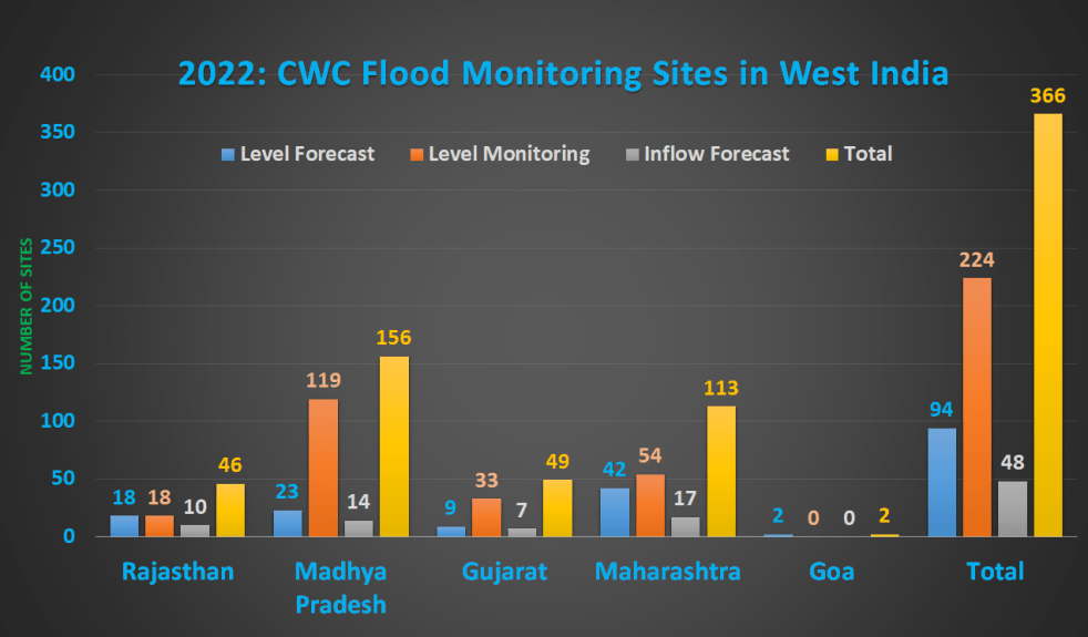 (Feature Image: Bar chart showing CWC flood monitoring sites excluding UTs of Dadar & Nagar Haveli and Daman & Diu in West India in 2022)