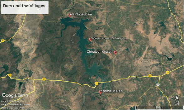 As we were walking upstream along river Sindh finding our way through google maps, crossing multiple bends and forest patches along the Atal Sagar dam, we reached a village called Chhatpur-Khajuri which still appears on the google map but is now completely submerged under the dammed waters of river Sindh. As we walked further, we realized Chhatpur is not the only village which got submerged, there were multiple villages on the map like Khajuri, Binega, Dehri, Bamnaua to name a few.
