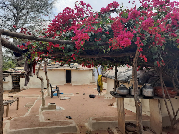 As urbanites, there is certainly an element of wonder and curiosity when we come across village life different from the conventionally imagined life of a rural area. This was a village off the grid, quite literally. As we walked little uphill, from the receding waters of the dam, through a forest patch of Chheola (Butea monosperma) & Kahua (Terminalia arjuna), we reached a tribal settlement in the outskirts, mud houses covered with pink blooms of Bougainvillea, and courtyards filled with drying barks of Arjun, surrounded by trees of Doodhi (Wrightia tinctoria). We imagined its splendour and the intoxicating fragrance in summers. Moving further ahead, entering another settlement of Karmai Kalan village, we realized something was amiss. When asked “Who is the head of this village?” Bharat Gurjar, a resident, smiled and replied, “Everyone is the head/Pradhan in this village”. It was quite an unexpected reply, nevertheless as he beckoned, we walked with him to his house, from where he showed us around the village.