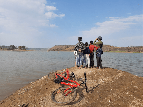 As we walked around the village, a few curious kids who were excited to show us the birds and crocodiles, led us to the dam’s backwaters to have a look through binoculars. One of them, Ashu, was busy washing his bicycle in the water, and he waved at us and exclaimed, “Wo dekho dog” [look! There is a dog]. It was surprising for us to hear an English word from a kid who is growing up in this isolated village. Pooja asked him if he goes to school, and he replied that he went to school till 1st class when his family was in Bhopal, but they had to leave the city because of the pandemic, and now he cannot continue the school, since there is none.
