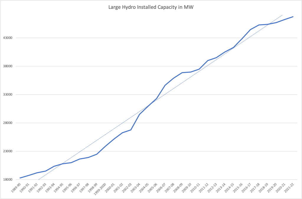 In 2016-17, for the first time in independent India’s history, power generation from large hydropower projects in India fell below 10% of total electricity generation and remained below 10% for the next three years: 2016-17, 2017-18 and 2018-19. This analysis is based on actual generation (measured as Million or Billion Units[ii]) as reported by Central Electricity Authority (CEA) and not installed capacity (measured in Mega Watts).